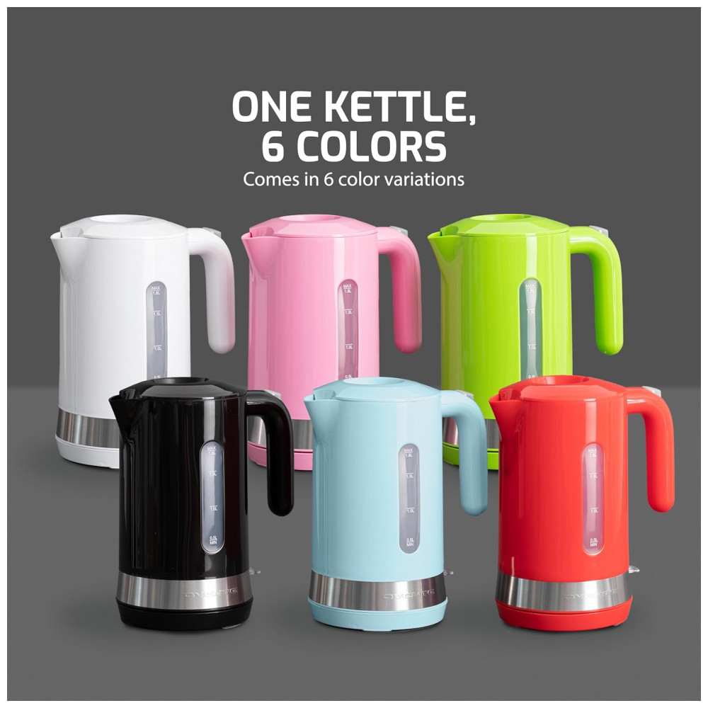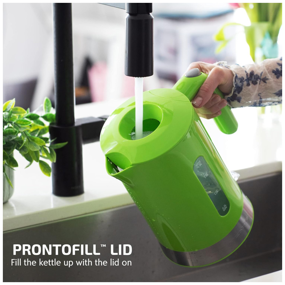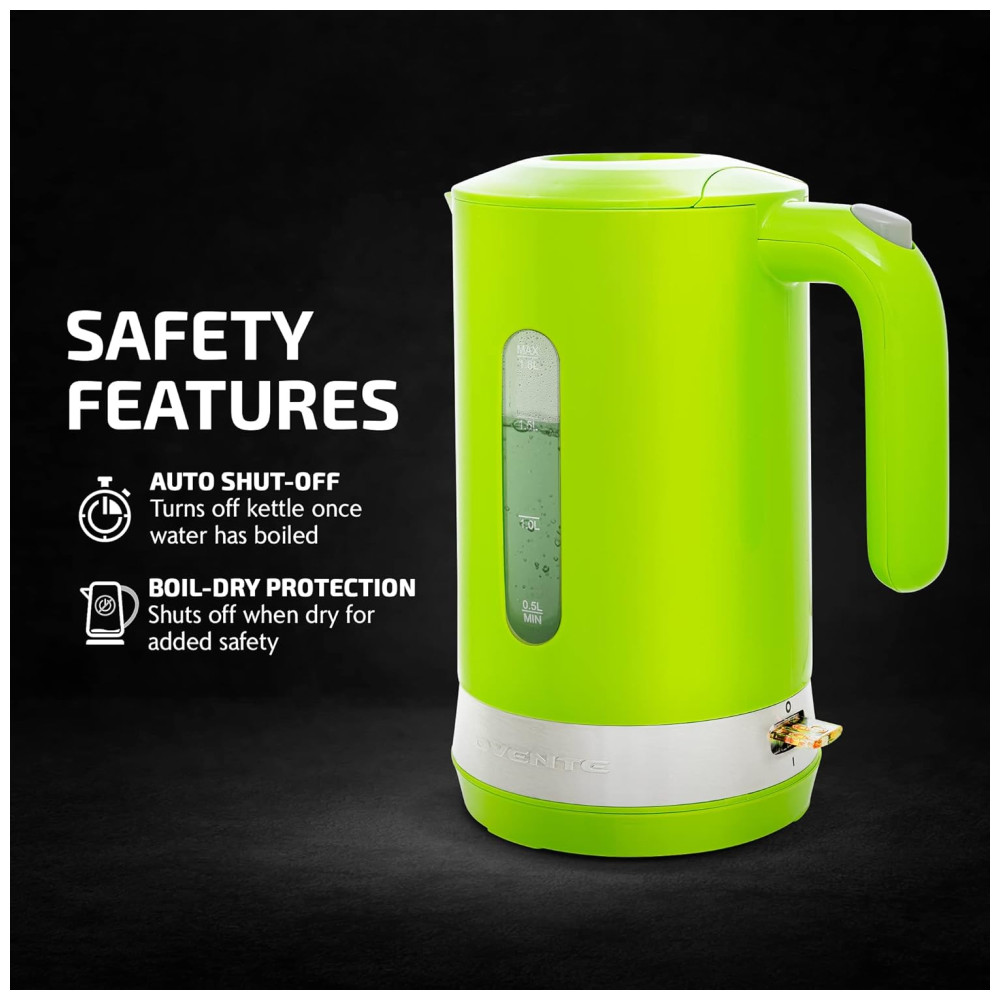 A mais recente adição à linha de chaleiras ProntoFill da OVENTE vem em cinco elegantes variações de cores – preto, verde, azul claro, rosa, vermelho e branco. Esta chaleira elétrica de 1,8L possui uma faixa elegante de aço inoxidável que realça lindamente seu design, enquanto a janela de visualização oferece uma indicação clara do nível de água. Com um recurso de desligamento automático, a chaleira se desliga automaticamente assim que a água ferve. Também inclui a tecnologia de proteção contra fervura a seco, impedindo que a chaleira aqueça se ligada vazia. Graças à inovadora tampa ProntoFill, não é necessário abrir a tampa para reabastecer a chaleira. Basta despejar água pela tampa para recargas fáceis com uma mão. Além disso, a chaleira possui uma tampa de abertura fácil para limpeza, um filtro de bico removível que garante água livre de resíduos, e um elemento de aquecimento oculto de aço inoxidável que reduz a acumulação de minerais, o que significa que você precisará descalcificar sua chaleira com menos frequência. Para maior conveniência, o interruptor na base da chaleira se ilumina de vermelho quando está aquecendo, e uma vez que a água ferve, o interruptor se levanta e a luz vermelha se apaga. A base também inclui compartimentos embutidos para armazenamento do cabo, ajudando a manter sua cozinha organizada. OBSERVAÇÃO: Chaleiras elétricas podem atingir a fervura mais rapidamente em altitudes elevadas devido à flutuação dos pontos de ebulição. CUIDADO: O CORPO DA CHALEIRA PODE FICAR EXTREMAMENTE QUENTE DURANTE A OPERAÇÃO. POR FAVOR, TENHA MUITO CUIDADO E USE A ALÇA ANTITÉRMICA PARA EVITAR QUEIMADURAS. CAPACIDADE AMPLIADA Ferva água mais de 2X mais rápido do que em fogão com o potente elemento de aquecimento de 1500W, permitindo aquecer rapidamente até 1,7 litros de água economizando tempo e energia. A tampa articulada abre com o toque de um botão para uso e limpeza fáceis. O bico está equipado com um filtro removível, garantindo água livre de resíduos toda vez. Basta deslizar o filtro para fora para limpeza fácil e depois recolocá-lo para uso. TECNOLOGIA PRONTOFILL Equipado com nossa patenteada Tecnologia ProntoFill, uma inovação revolucionária no design de chaleiras. Com a exclusiva tampa ProntoFill, você pode reabastecer a chaleira facilmente sem nunca abri-la! Basta despejar água diretamente pela tampa para recargas rápidas e com uma mão. Perfeito para multitarefas enquanto você está em movimento. FERVAÇÃO SEGURA E SEM PREOCUPAÇÕES Esta chaleira rápida e sem BPA foi projetada com segurança em mente. Possui uma função de desligamento automático que desliga a chaleira automaticamente assim que a água ferve. Também inclui tecnologia de proteção contra fervura a seco, impedindo que a chaleira aqueça se ligada vazia, proporcionando tranquilidade durante o uso. CONVENIÊNCIA NO SEU MELHOR Projetada para máxima facilidade de uso. Possui um medidor de nível de água e uma luz indicadora que informa quando a chaleira está aquecendo. Basta pressionar o interruptor e ele se iluminará de vermelho. Assim que a água ferver, o interruptor se levanta e a luz vermelha se apaga. Além disso, a base inclui compartimentos embutidos para armazenamento do cabo, ajudando a manter sua cozinha organizada.