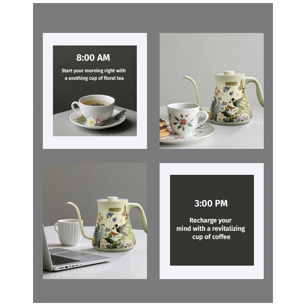 A chaleira elétrica INFOOD Pescoço de Ganso 0,8L combina design floral retrô com alta tecnologia, perfeita para cafés coados e chás. Possui bico pescoço de ganso para despejo fino e preciso, garantindo extração ideal e sabor destacado em cada preparo. O controle digital permite selecionar e manter a temperatura desejada entre 40°C e 100°C pelo painel LCD, ideal para métodos que exigem precisão térmica. Sua potência de 1200W entrega fervura rápida em poucos minutos. Construção em aço inox 304, livre de substâncias tóxicas, com pintura manual floral elegante. Inclui proteção contra superaquecimento, desligamento automático e função de agendamento, permitindo programar aquecimento na hora desejada. Função “manter aquecido” dispensa a necessidade de reaquecimento a cada uso. Limpeza indicada manualmente.