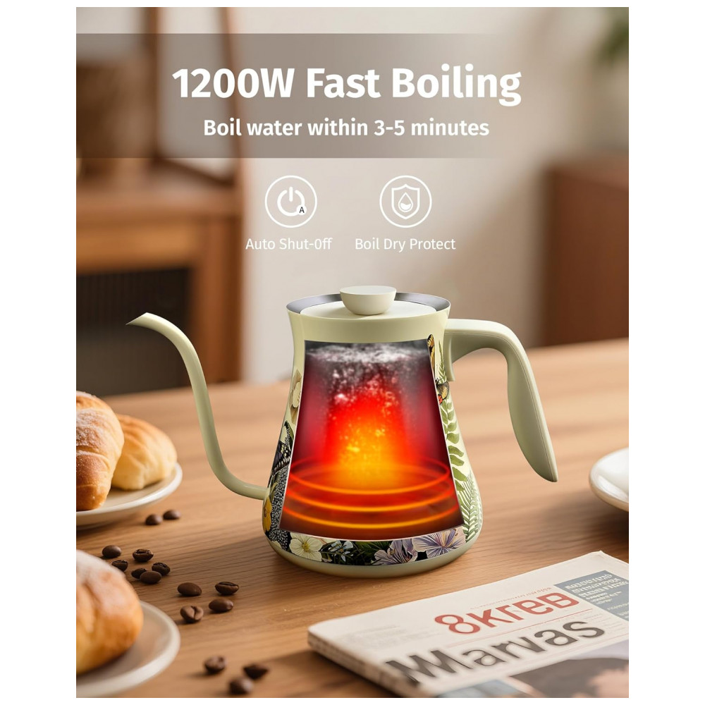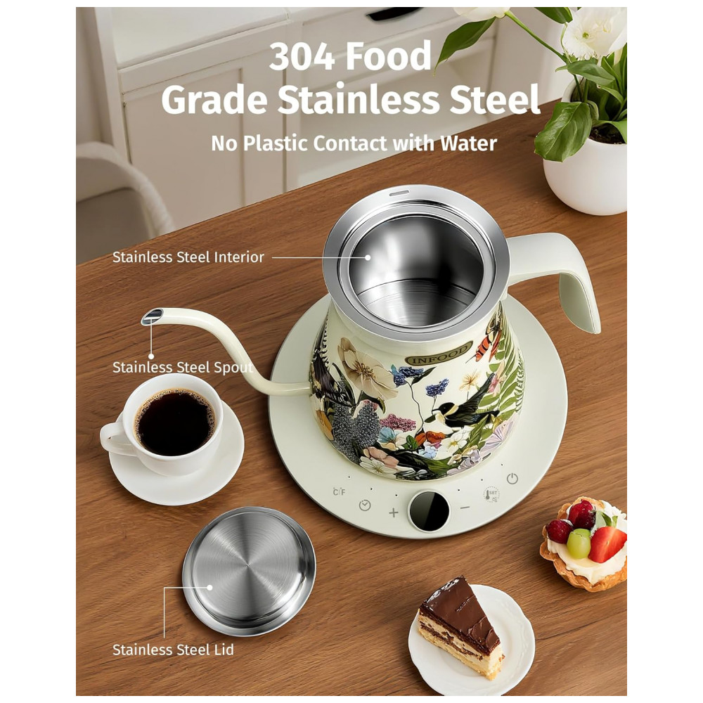 Chaleira Elétrica Pescoço de Ganso 08L INFOOD Floral Controle Preciso de Temperatura Agendamento Inox Desligamento Automático 1200W 110V