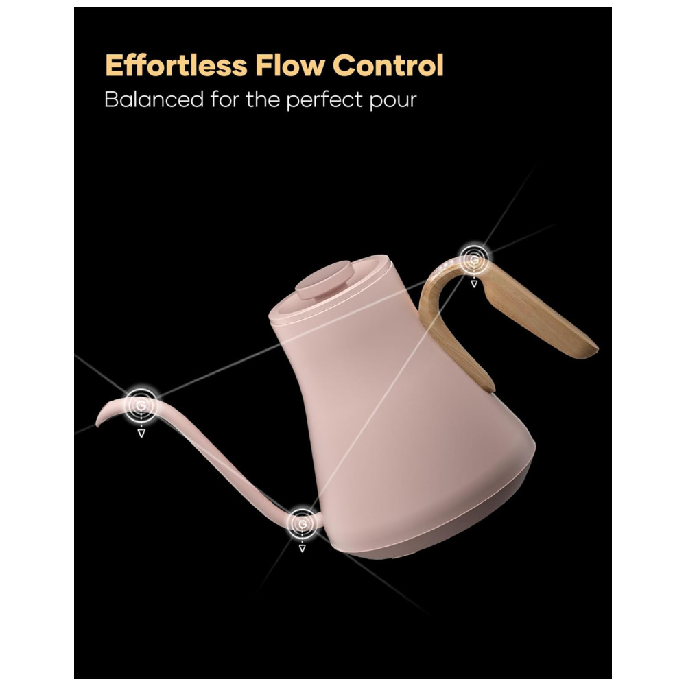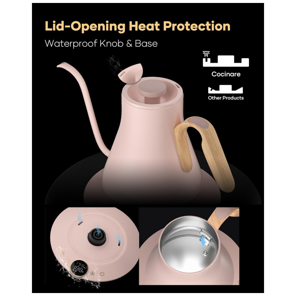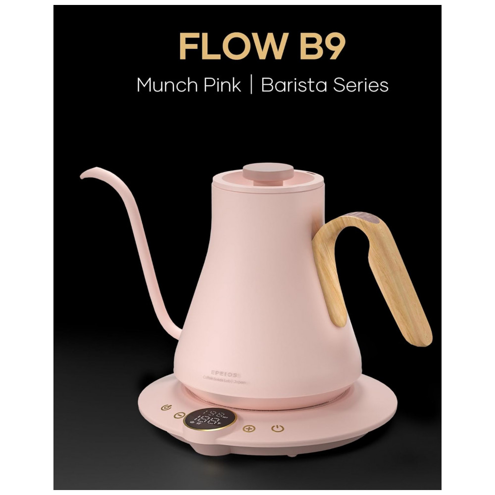 A chaleira elétrica Cocinare FLOW B9 rosa Munch possui capacidade de 0,9 litro e interior em aço inoxidável, indicada para aquecimento de água e preparo de café pour-over, chá e outras bebidas quentes com controle eletrônico de temperatura. A base inteligente oferece display digital, ajuste de temperatura e função de manter aquecido por até 1 hora, trabalhando com potência de 1500W para aquecimento rápido em uso doméstico.