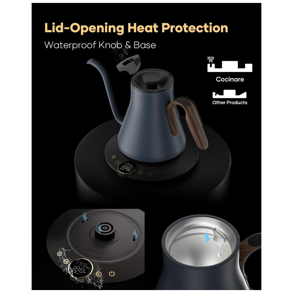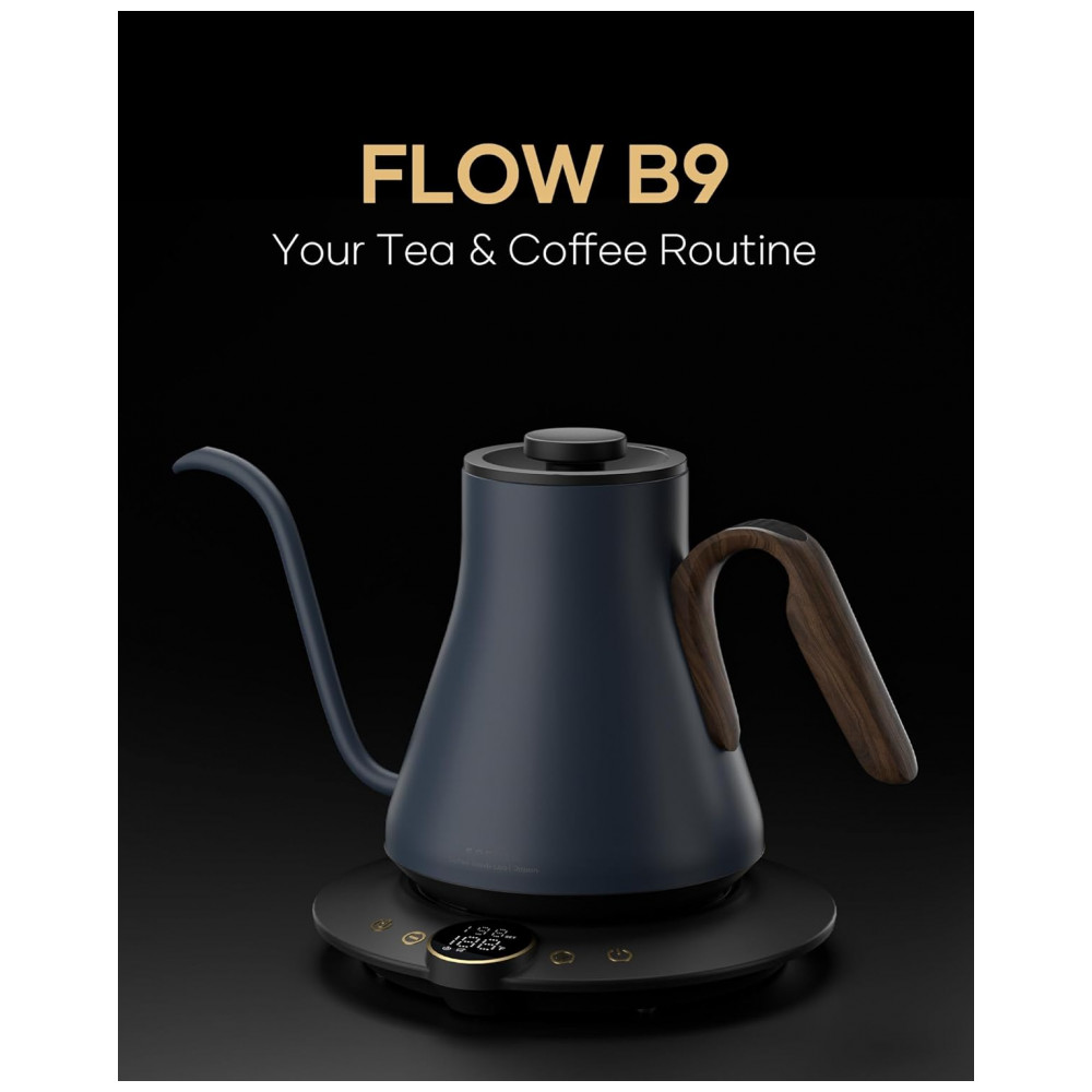 A chaleira elétrica Cocinare FLOW B9 Azul Picasso possui capacidade de 0,9 litro e interior em aço inoxidável, indicada para aquecimento de água e preparo de café pour-over, chá e outras bebidas quentes com controle eletrônico de temperatura. A base inteligente integra display digital e função de manter aquecido por até 1 hora, utilizando potência de 1500W para aquecimento rápido em uso doméstico.
