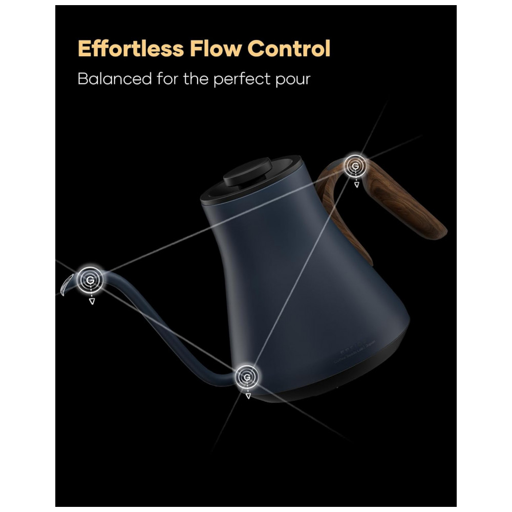 O bico em pescoço de ganso em formato S foi projetado para fluxo estável e direcionado, auxiliando no controle de vazão durante o preparo de café filtrado. O corpo metálico em acabamento Picasso Blue trabalha em conjunto com a base com desligamento automático, proteção contra superaquecimento e fervura a seco, em operação elétrica em 110V.