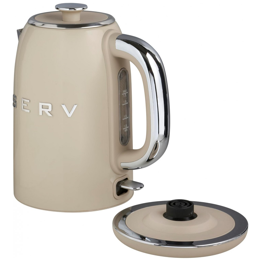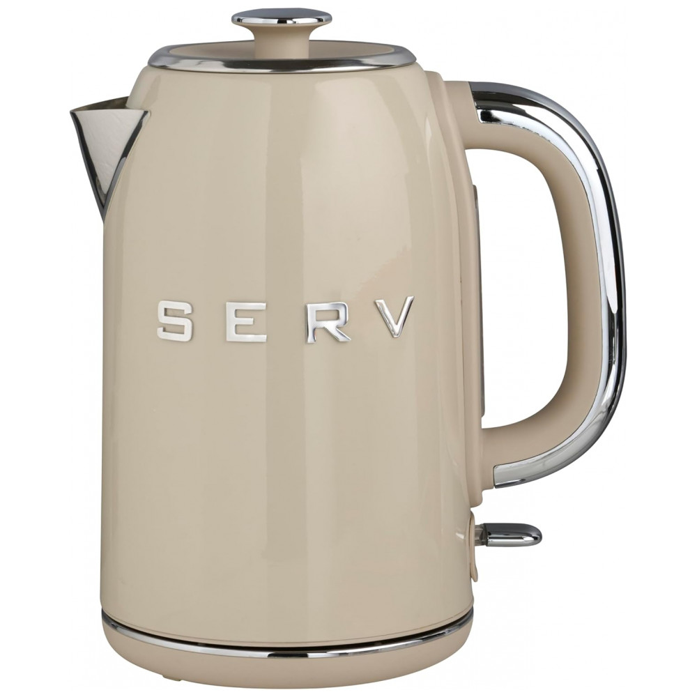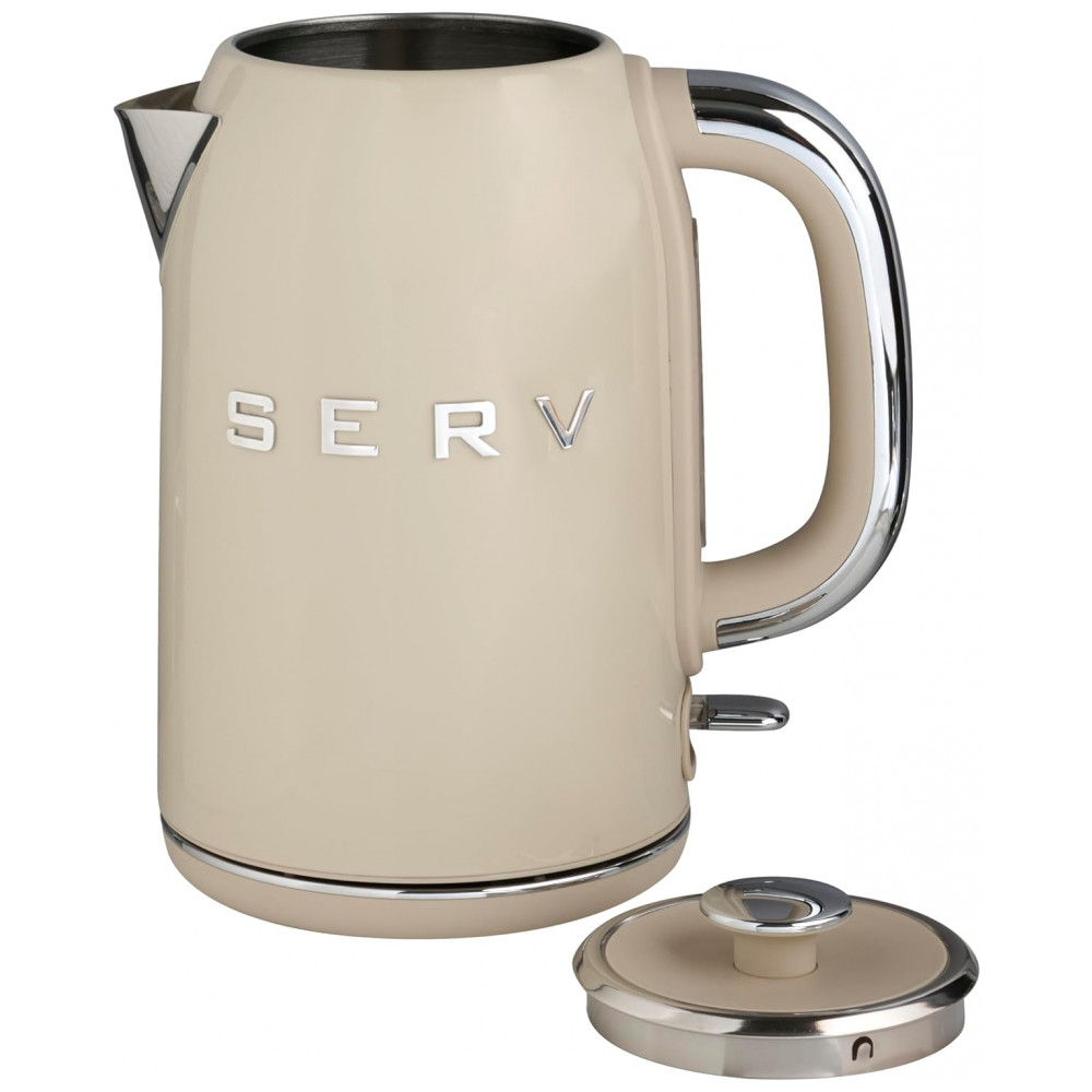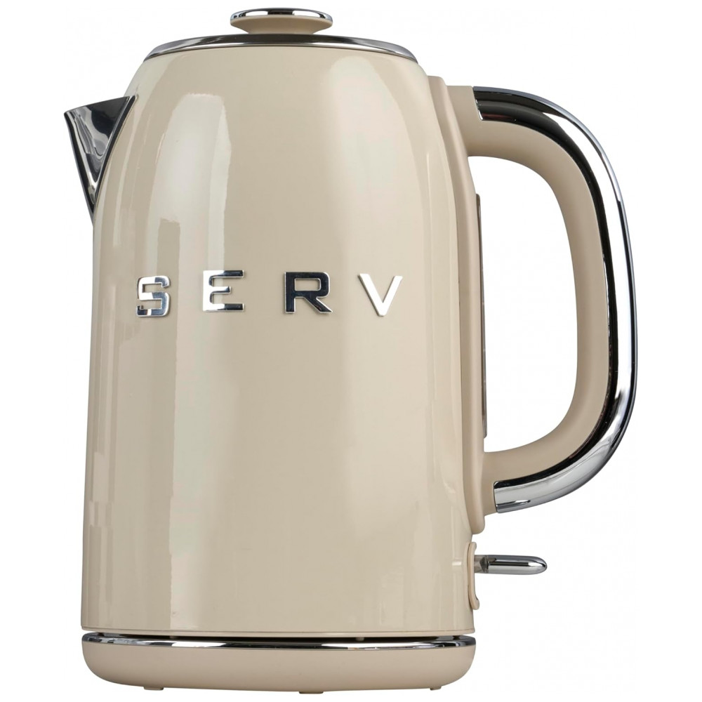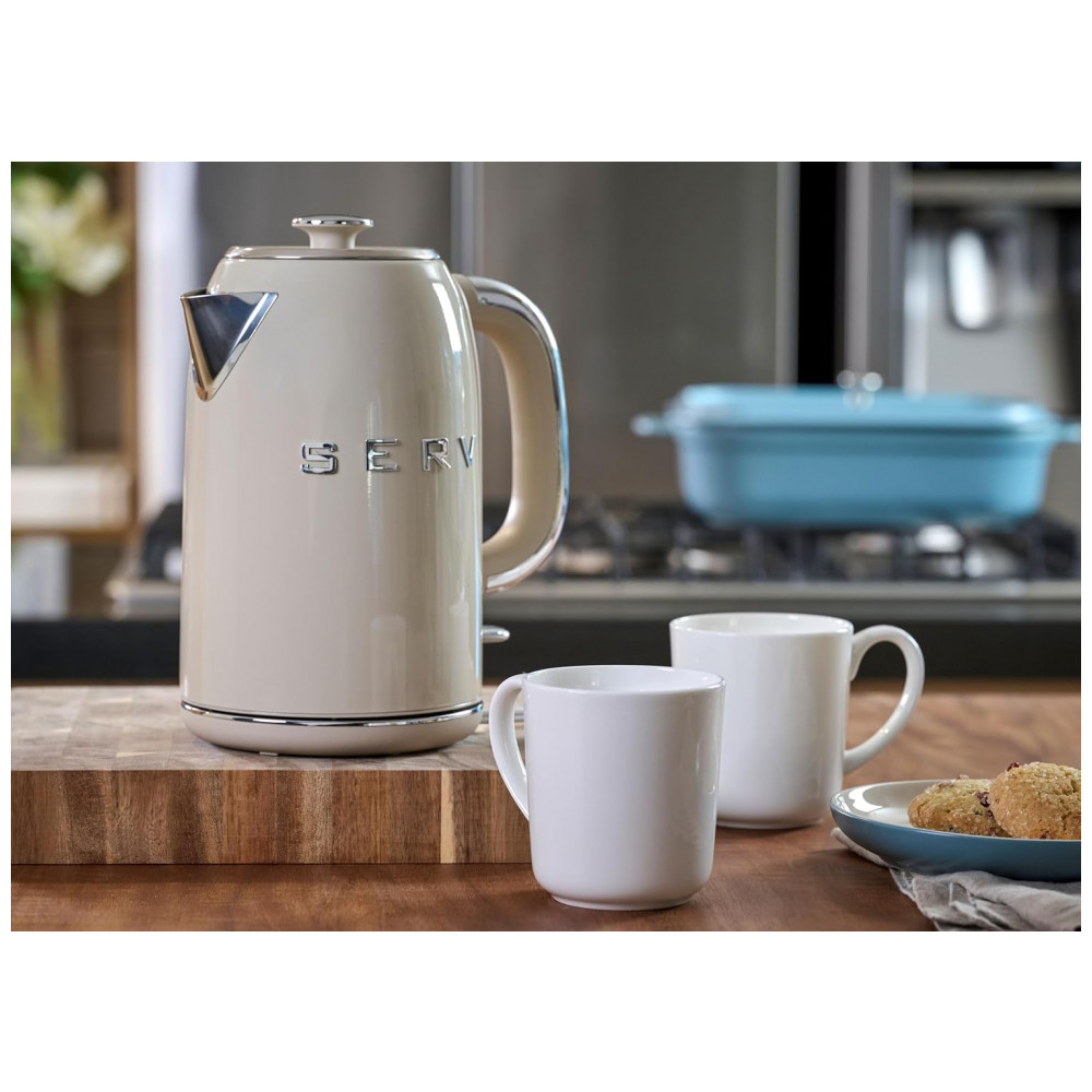 A chaleira elétrica retrô Servappetit Retro Serv possui jarra em aço inoxidável com capacidade de 1,7 litros, indicada para aquecimento de água em uso doméstico para chás, cafés instantâneos e outras bebidas quentes. O acabamento em cor creme com design de inspiração mid-century foi desenvolvido para compor bancadas de cozinha que valorizam estética retrô, mantendo foco em funcionalidade técnica.