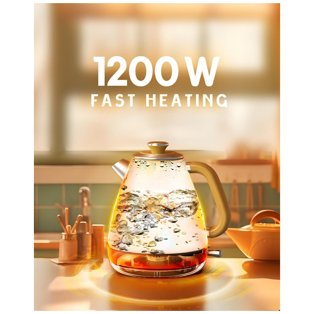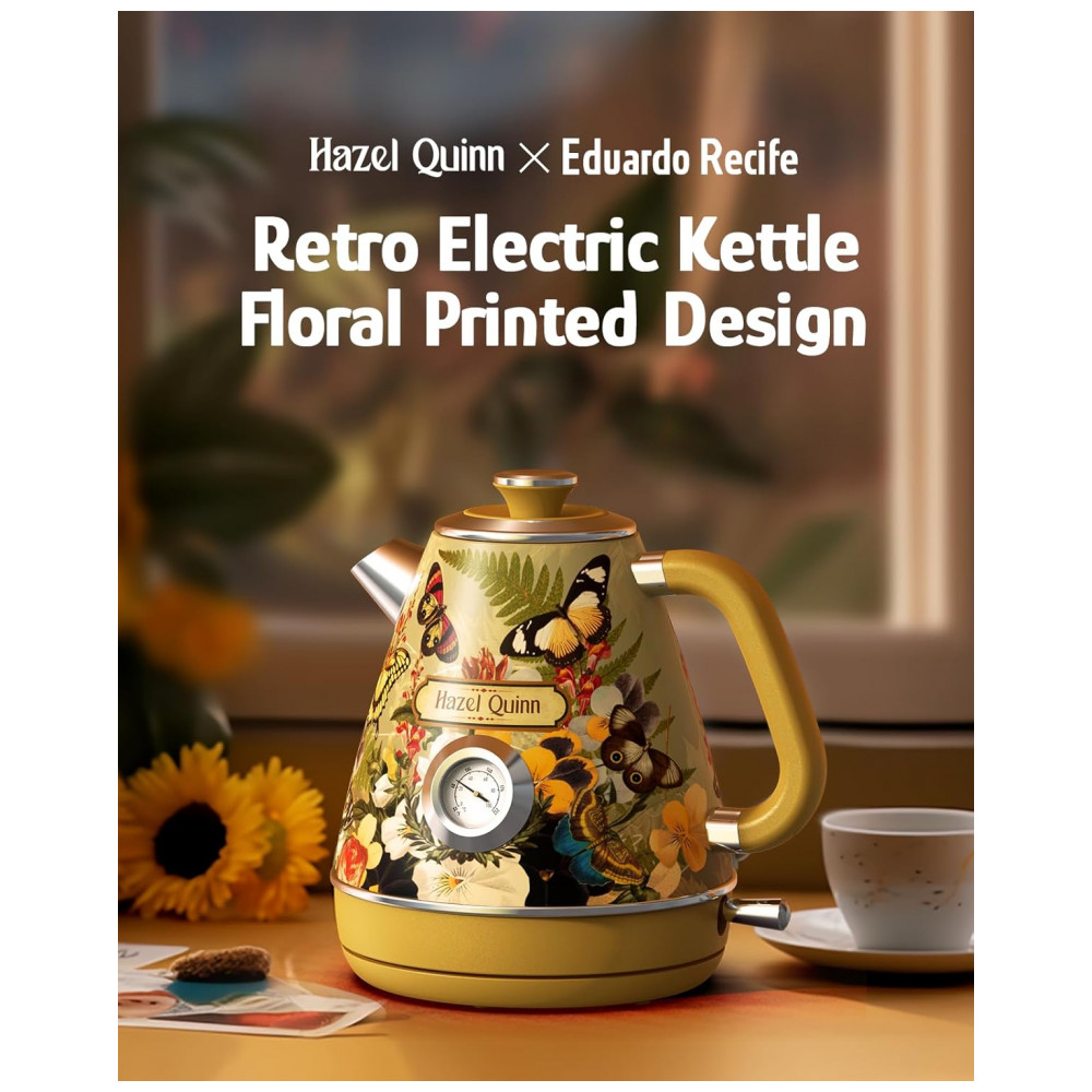 A chaleira elétrica retrô Hazel Quinn X Eduardo Recife de 1,7L foi desenvolvida para aquecimento rápido de água em uso doméstico, com corpo em aço inoxidável 304 de grau alimentar e design vintage inspirado nos anos 70. O sistema de aquecimento de 1200W, combinado à base giratória de 360°, permite ferver até 1,7 litros de água em cerca de 4 a 5 minutos, com operação sem fio após a retirada da chaleira da base.