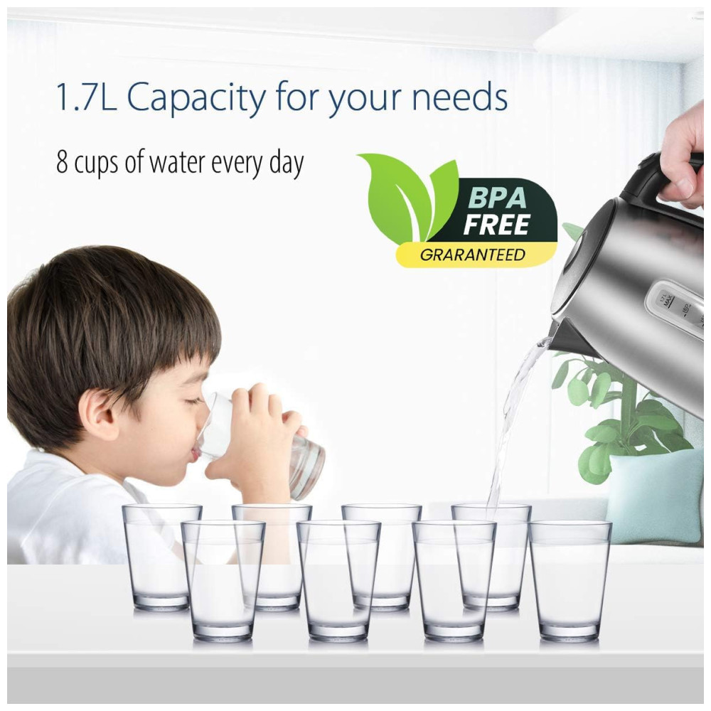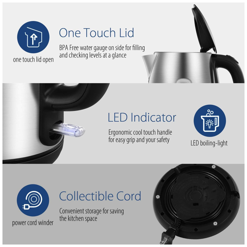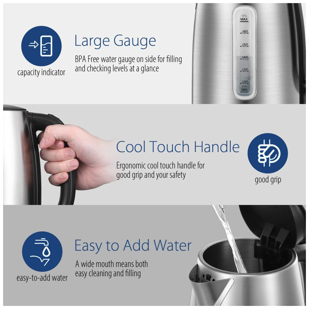 Fast Boil Esta chaleira elétrica de 1500 W tem elementos de aquecimento ocultos e pode ferver até 1,7 litros de água em 5 a 7 minutos, de forma mais rápida e segura do que um micro ondas. Comece o dia com uma xícara de café ou chá instantâneo.