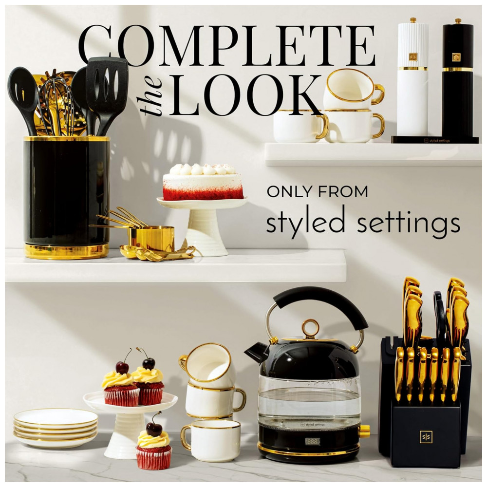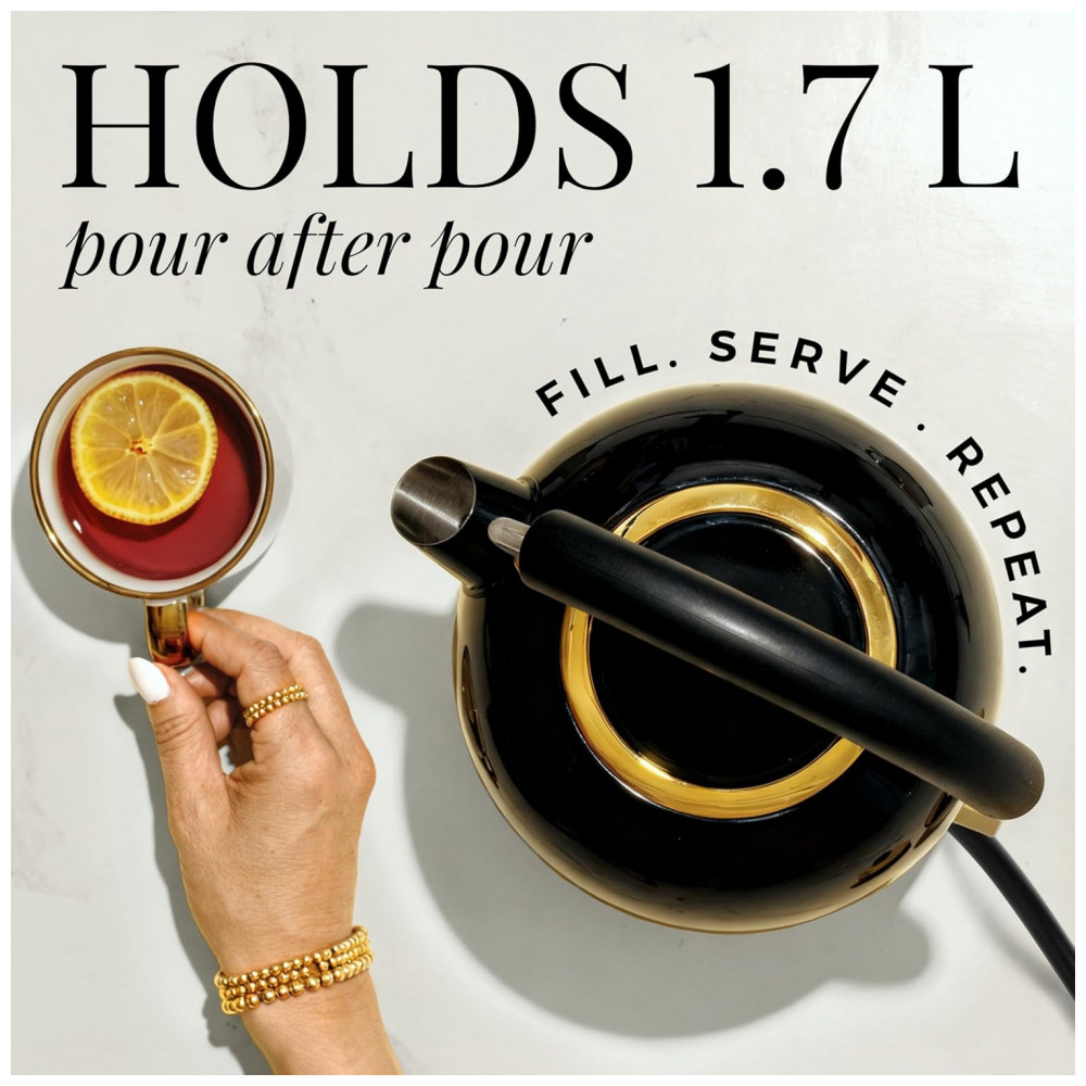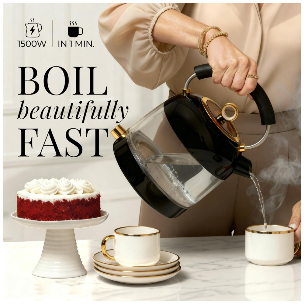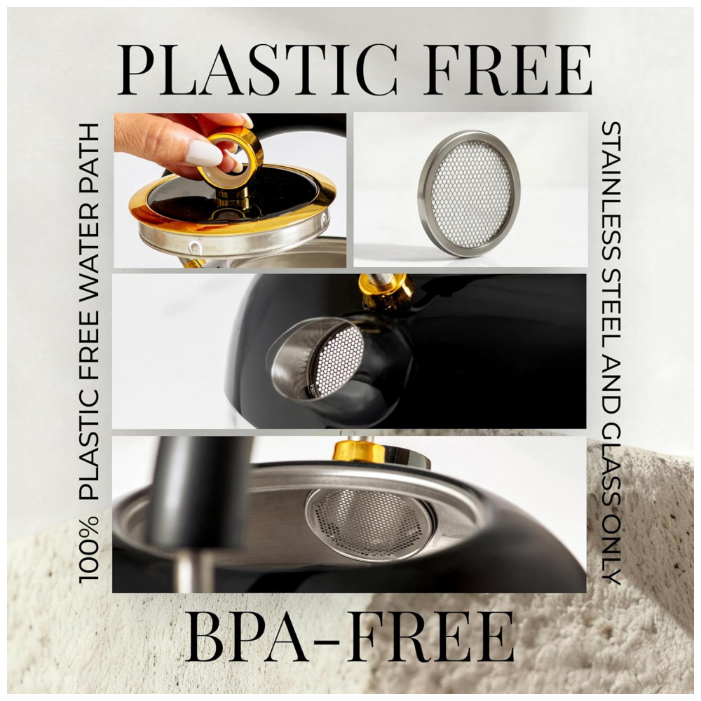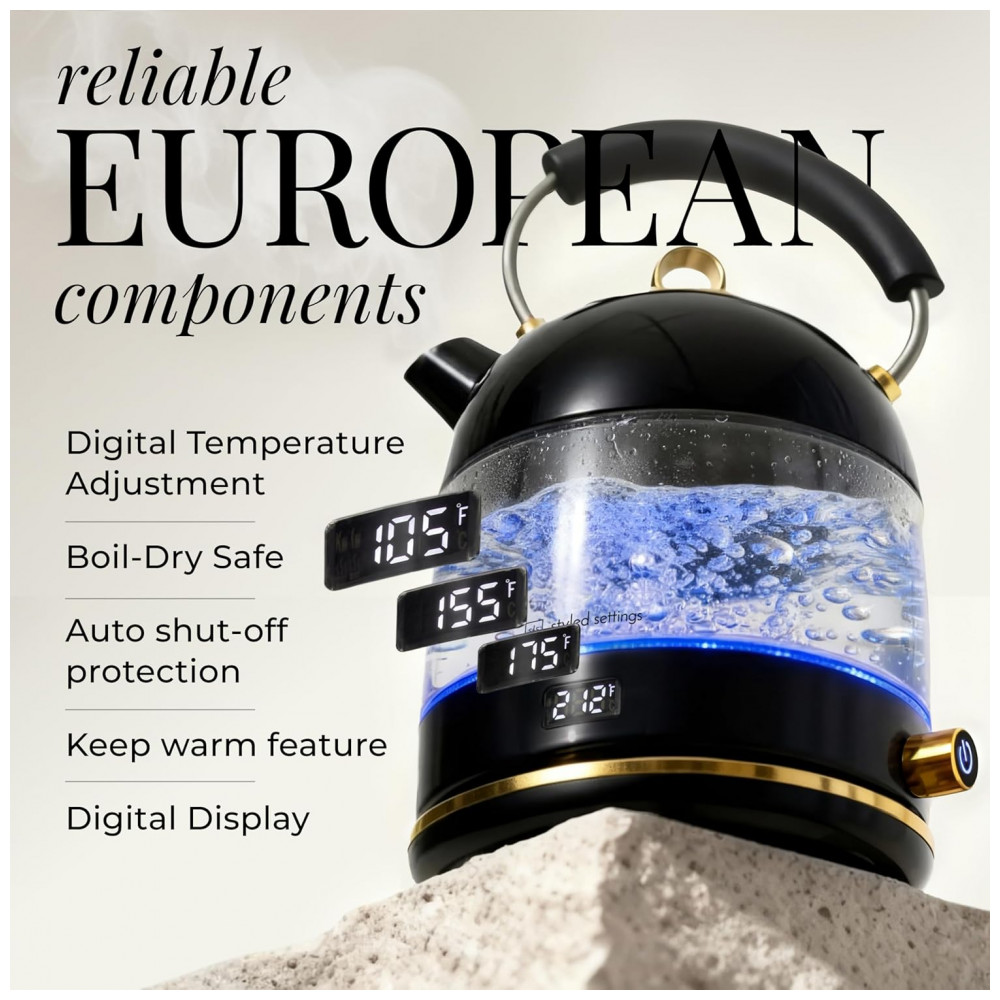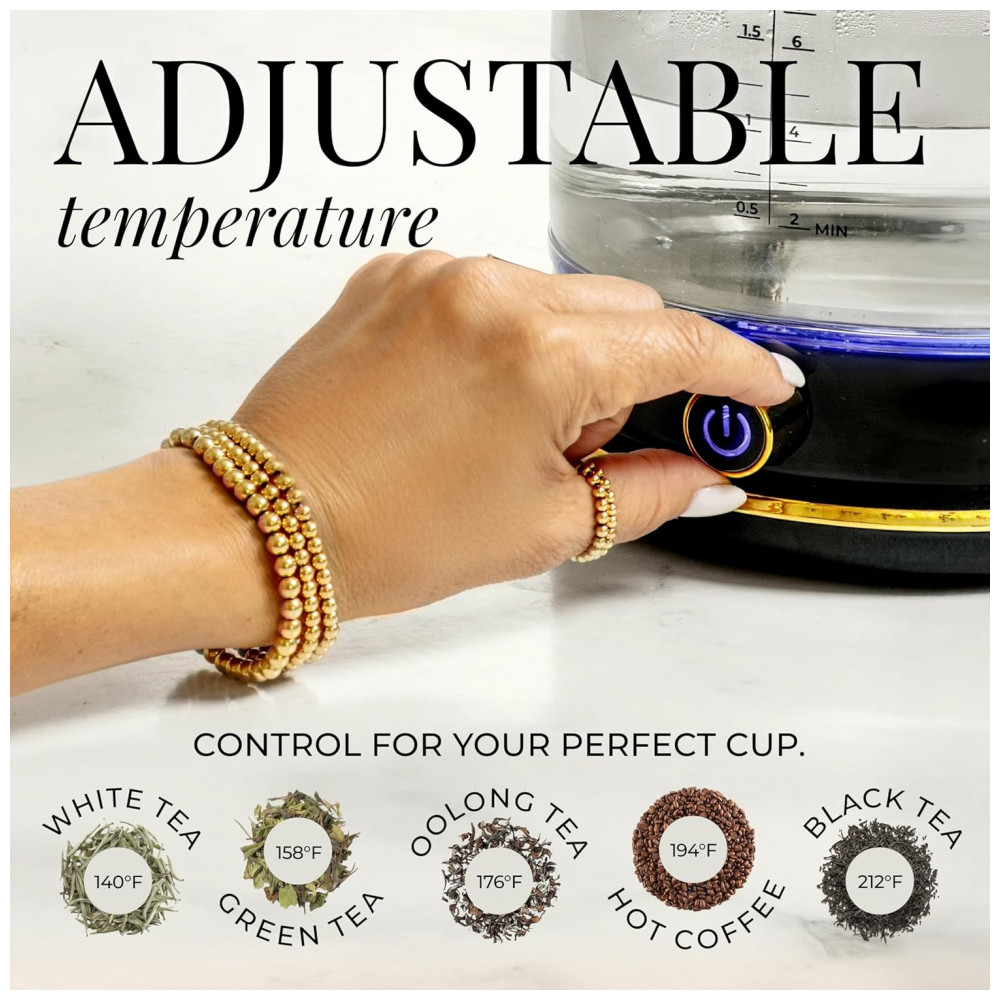 Chaleira elétrica STYLED SETTINGS vidro preto e dourado 17L 1500W controle de temperatura sem plástico em contato com a água 110V