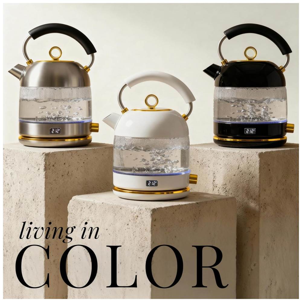 A chaleira elétrica STYLED SETTINGS em vidro e aço inoxidável com capacidade de 1,7 litros foi desenvolvida para aquecimento rápido de água em uso doméstico, atendendo preparos de chá, café e outras bebidas quentes com controle de temperatura. A potência de 1500W proporciona aquecimento eficiente, reduzindo o tempo necessário para atingir a fervura, enquanto o corpo em vidro permite visualizar o volume de água e o processo de aquecimento.
