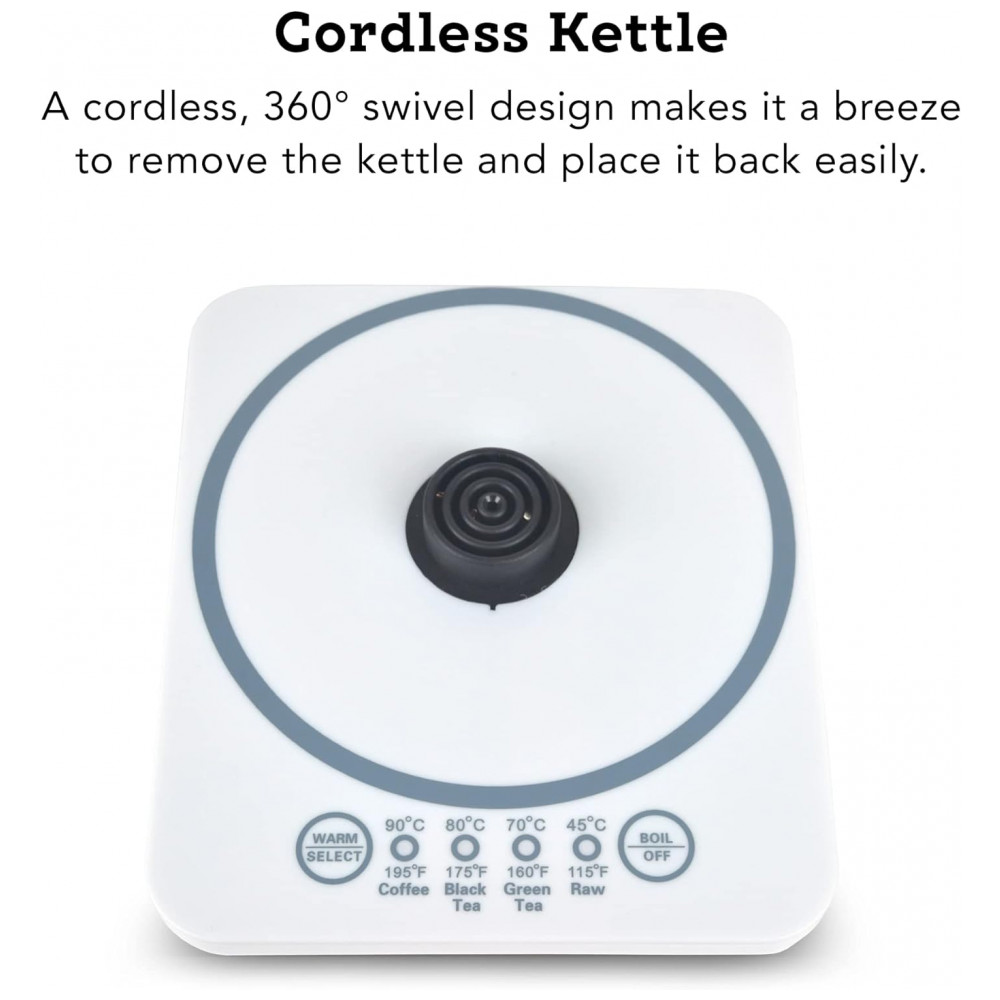 Pré ajustes convenientes controles de temperatura precisos e versáteis permitem que você programe a chaleira para suas necessidades específicas ferver, aquecer, café, chá preto, chá verde e configurações de temperatura crua.