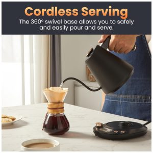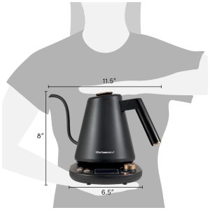 A Chaleira Digital Elite Gourmet 1L com bico de ganso é a melhor maneira de preparar água quente para café coado, chá e alimentos que requerem adição de água quente, como chocolate quente instantâneo, aveia, macarrão instantâneo e outras sopas. Basta selecionar uma das temperaturas pre programadas ou ajustar para a temperatura desejada, pressionar Iniciar e você terá água quente pronta em minutos. Uma vez atingida a temperatura desejada ou a fervura, a chaleira emitirá dois bipes e desligará automaticamente ou entrará no programa de Manter Quente se selecionado. Não é necessário se preocupar ou ficar sobre uma chaleira ou panela no fogão. A segurança é primordial, então sua chaleira está equipada com proteção contra fervura a seco e desligamento automático. Se começar a aquecer e detectar a ausência de água na unidade, a chaleira desligará automaticamente para evitar danificar o elemento de aquecimento. Foi projetada com um bico de ganso para despejar com precisão, facilitando a preparação do café coado, bem como de suas outras bebidas quentes favoritas, sopas, macarrão e cereais quentes. Não há restrições de um cabo de alimentação fixado, então você pode servir e desfrutar de suas bebidas favoritas sem fio. Com a base de energia destacável que gira 360 graus, a função de Manter Quente é ajustável por até 2 horas de água quente. A base também conta com um compartimento oculto para armazenamento do cabo, mantendo suas bancadas livres de bagunça. DESIGN ELEGANTE, BELA E CLÁSSICA A Chaleira Digital Elite Gourmet 1L com bico de ganso é uma chaleira elétrica premium e sem fio projetada para café coado e outras bebidas quentes e alimentos que requerem água quente. Você apreciará seu elegante acabamento preto fosco com detalhes em cobre, que dá a qualquer cozinha uma atmosfera de bistrô sofisticado. TEMPERATURAS PRÉ-PROGRAMADAS Construída para desempenho e conveniência, esta chaleira elétrica tem 13 configurações de temperatura pré-programadas e 3 Configurações Personalizadas. O visor digital LED também exibe as temperaturas em tempo real selecionadas. O indicador sonoro emite dois bipes para avisar quando a temperatura selecionada é atingida e dá a opção de silenciar se não for necessário. Também possui uma função de Manter Quente para manter a água quente por até 2 horas. BASE GIRATÓRIA 360 E SERVIÇO SEM FIO A base giratória 360 permite que a chaleira gire de forma segura na base para um acesso total e sem risco de tombar. A característica sem fio oferece a flexibilidade para despejar e servir de forma conveniente e depois recolocar na base para manter a água quente por até 2 horas. RÁPIDA, CONVENIENTE E FÁCIL Com 1200 watts de potência, aquecerá rapidamente até 1 litro de água em menos de 6 minutos. Aproveite bebidas quentes como chá, café, chocolate quente ou desfrute de deliciosas sopas ou caldos, adicione água quente à aveia instantânea, cereais, macarrão instantâneo e até mesmo fórmula para bebês sem longas esperas. CARACTERÍSTICAS ADICIONAIS O bico de ganso de 90 graus é projetado para despejar com precisão cada vez, independentemente da aplicação. O interior e a tampa em aço inoxidável 304 de qualidade alimentar garantem água com sabor fresco, fácil limpeza e durabilidade. Marcação de nível de água MAX conveniente no interior para evitar transbordamento. A alça de toque frio é projetada para uma aderência confortável e uso seguro. DESIGN PREMIUM E EXCELENTE ACABAMENTO, para resultados que superarão até suas maiores expectativas. O bico de ganso Elite Gourmet possui um exterior elegante preto fosco e cobre com uma tampa que pode ser totalmente removida para uma limpeza fácil e completa. MARCA CONFIÁVEL Como uma marca confiável há 40 anos, a Elite Gourmet entregou produtos de cozinha de alta qualidade e elegantes que são acessíveis e fáceis de usar.