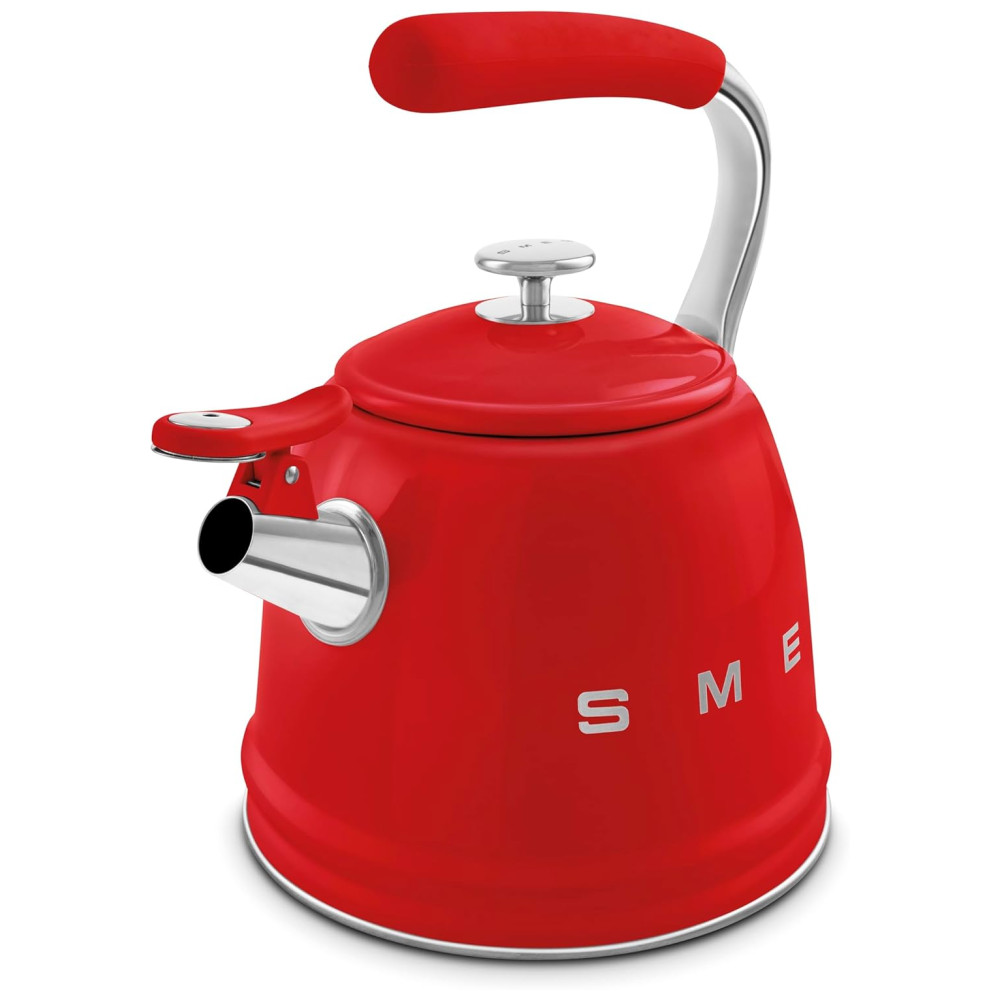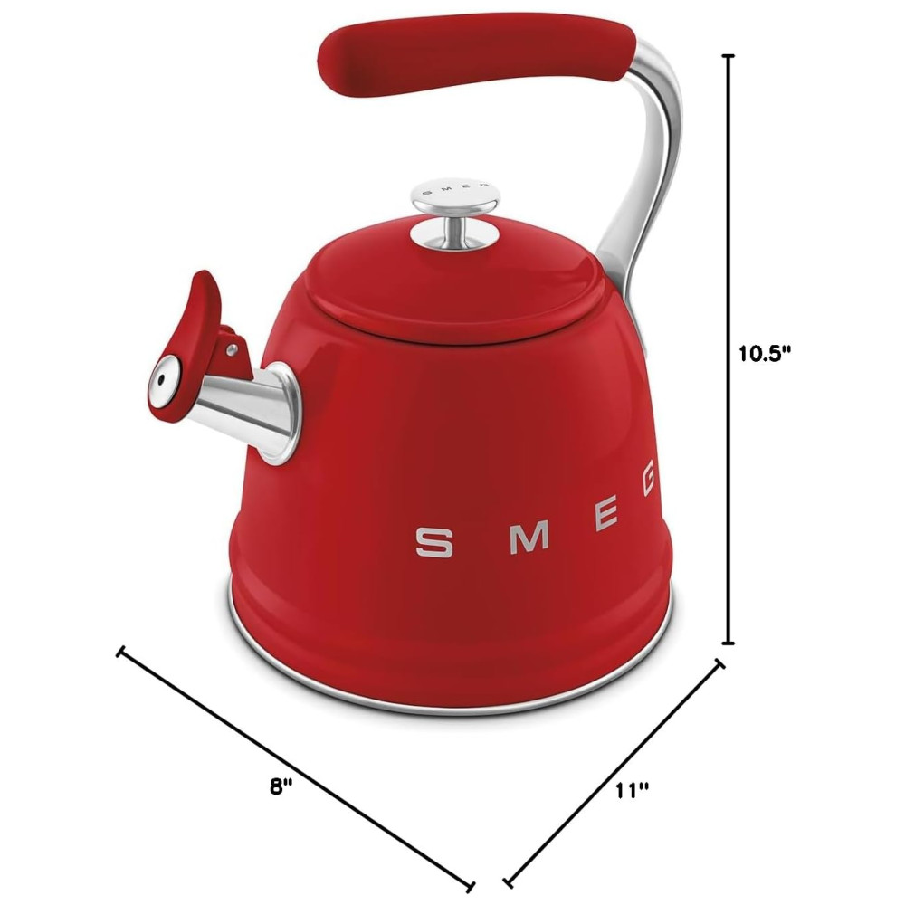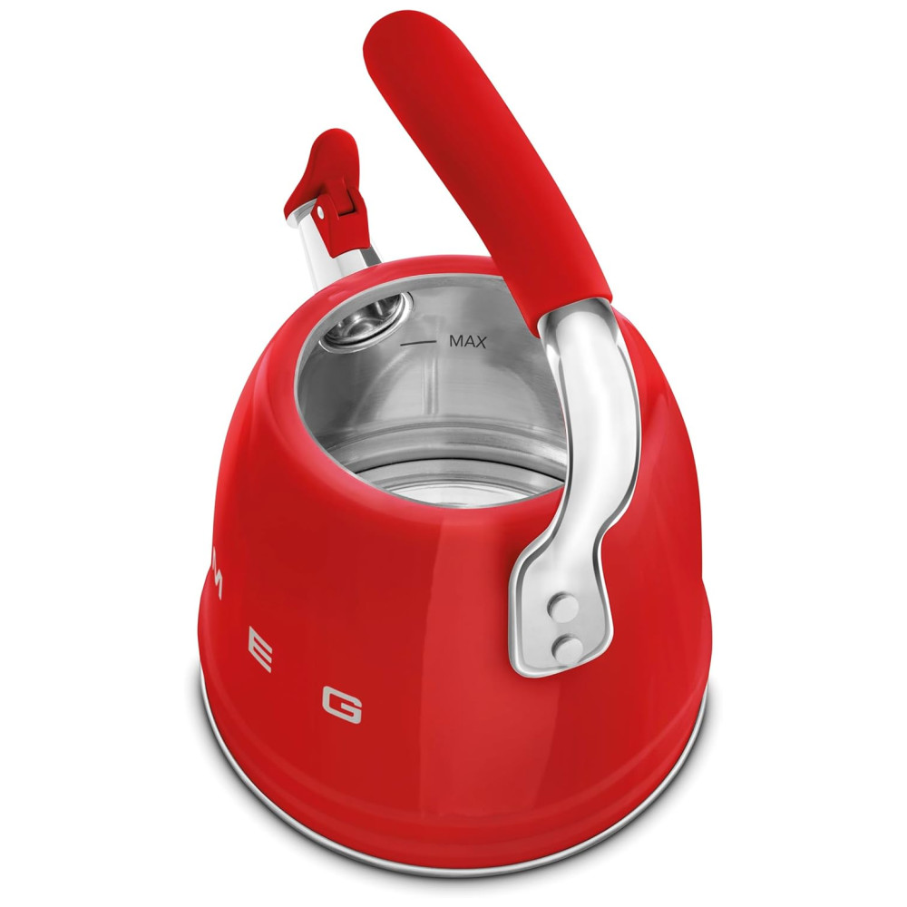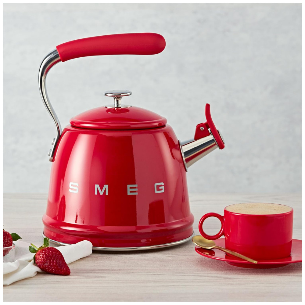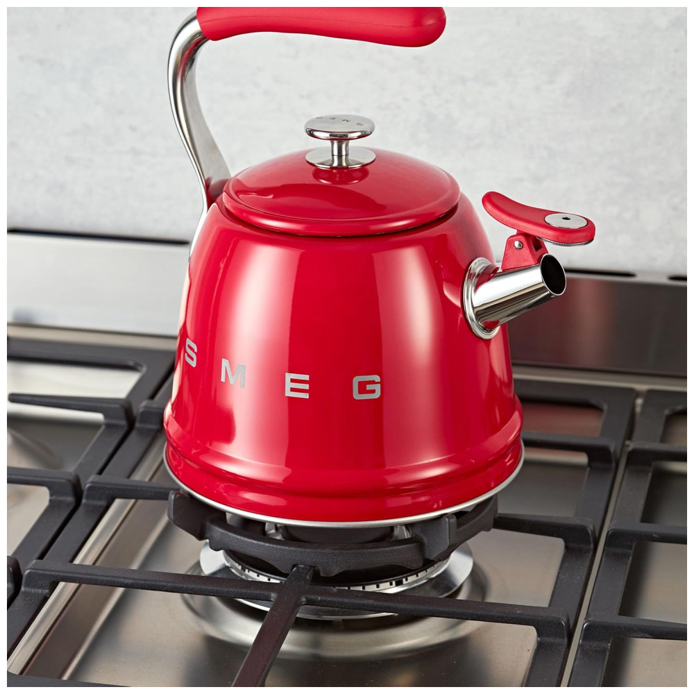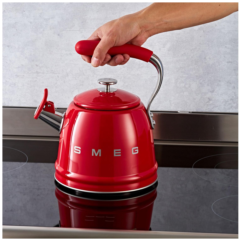 A Chaleira Smeg Retro 2,4L é uma peça atemporal que combina perfeitamente um design retrô inspirado no vintage com características inteligentes, tudo envolto em deslumbrantes tons de assinatura da Smeg. Eleve sua experiência de preparo de chá ou café com a Chaleira da Smeg. Sua combinação de funcionalidade e design icônico a torna indispensável para qualquer entusiasta de cozinha. Criada para impressionar. Com capacidade de 2,4L, equivalente a 10 xícaras, é compatível com vários tipos de fogões, incluindo indução. Possui apito fixo de único tom com bico sem gotejamento, base espessa para aquecimento uniforme, alça ergonômica e antiderrapante, tampa de bico de fácil abertura, tampa removível para limpeza fácil, marcador de nível de água e revestimento de alça de silicone resistente ao calor.