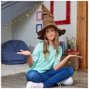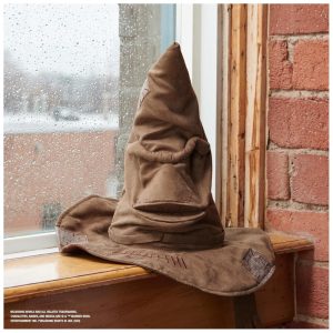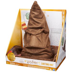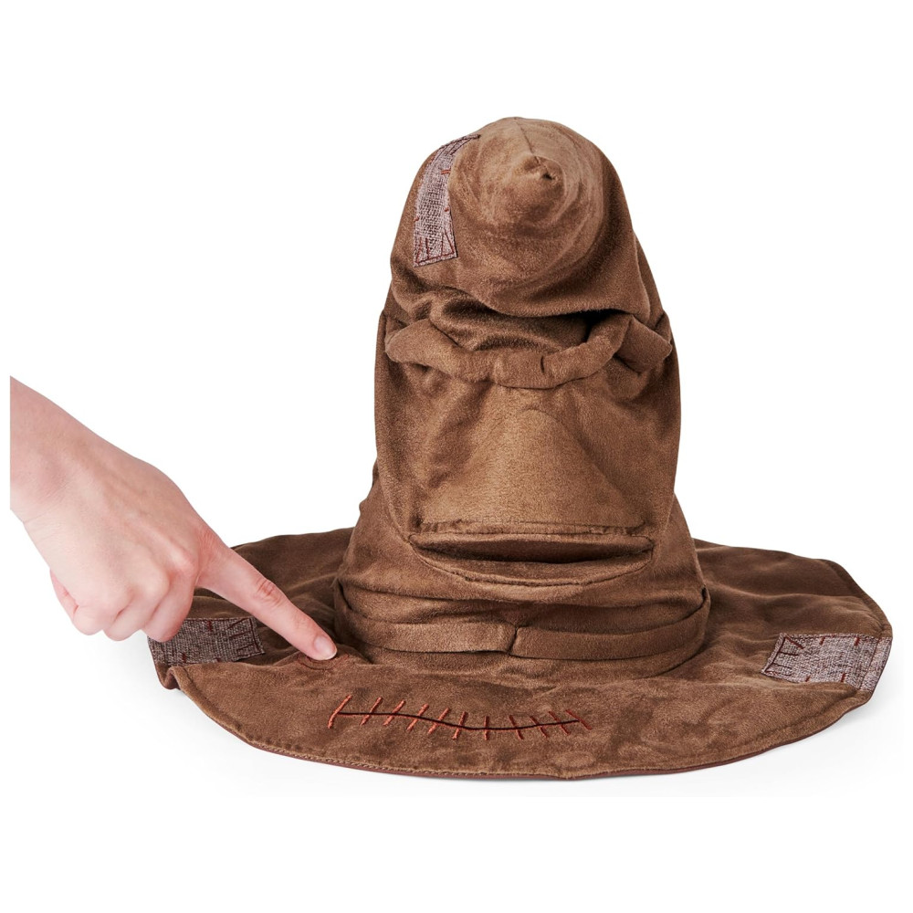 Coloque o chapéu na cabeça e ele responderá automaticamente, movendo suas sobrancelhas, cabeça e boca conforme determina e anuncia sua Casa de Hogwarts: Grifinória, Corvinal, Lufa-Lufa ou Sonserina. Pressione o botão na aba para ouvir mais frases encantadoras.