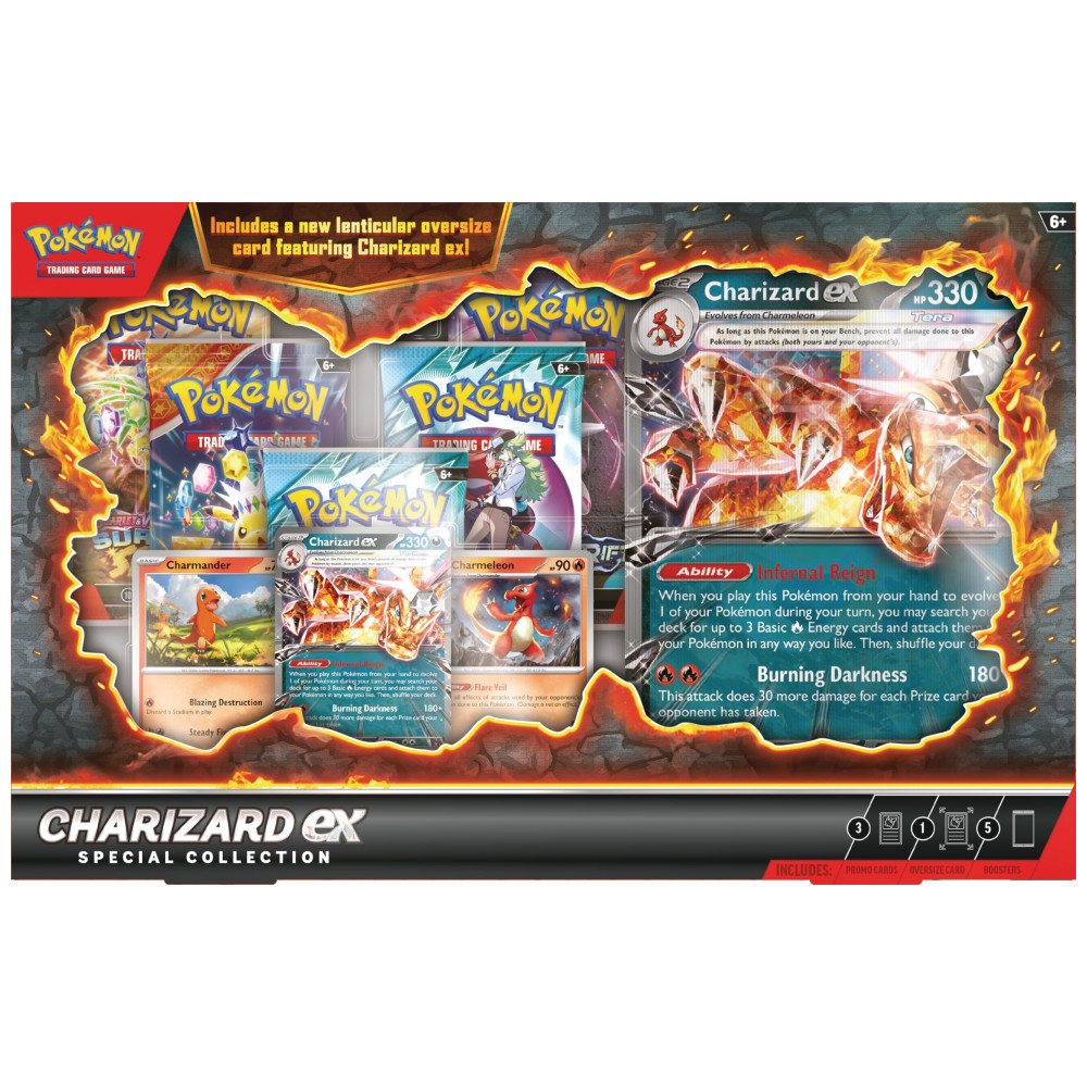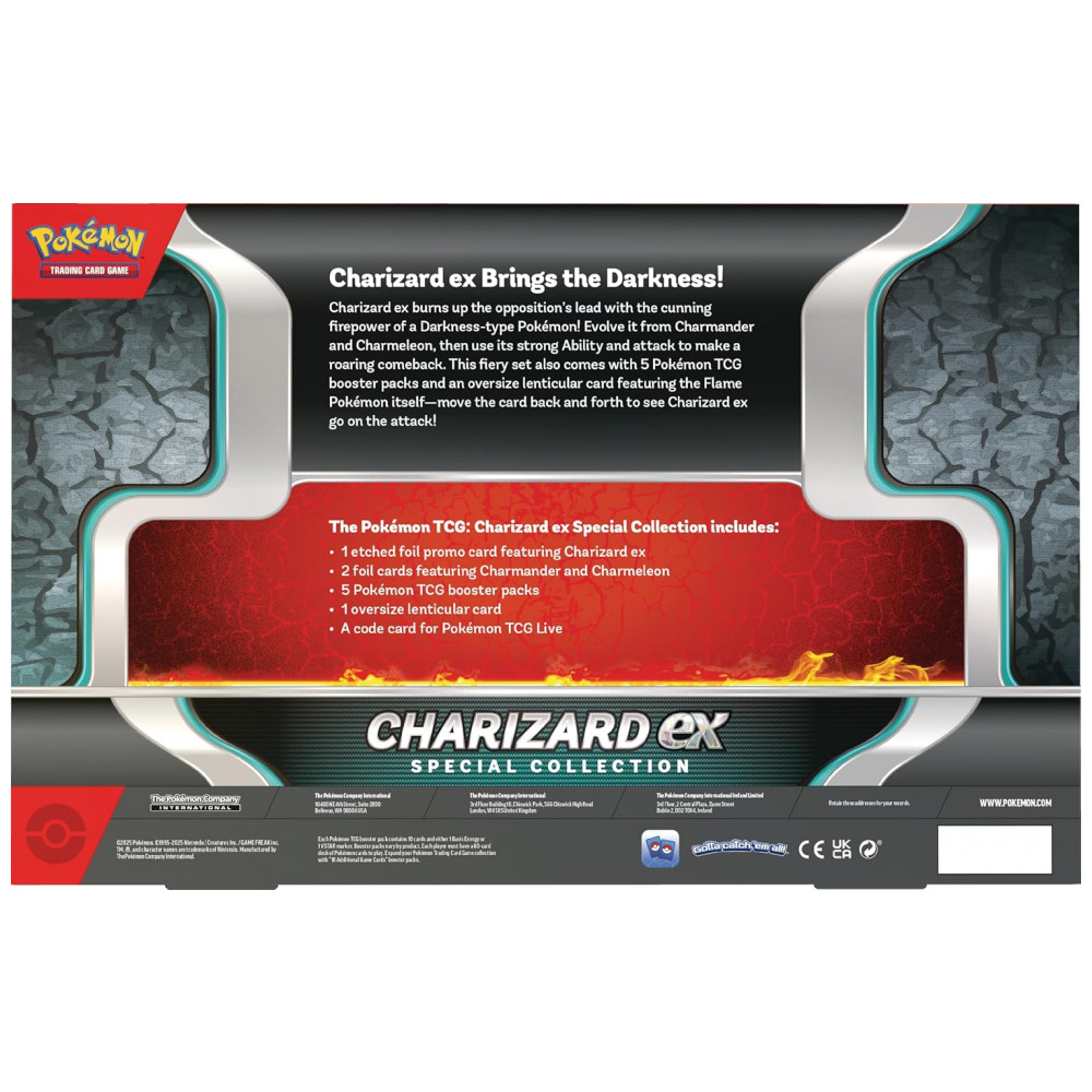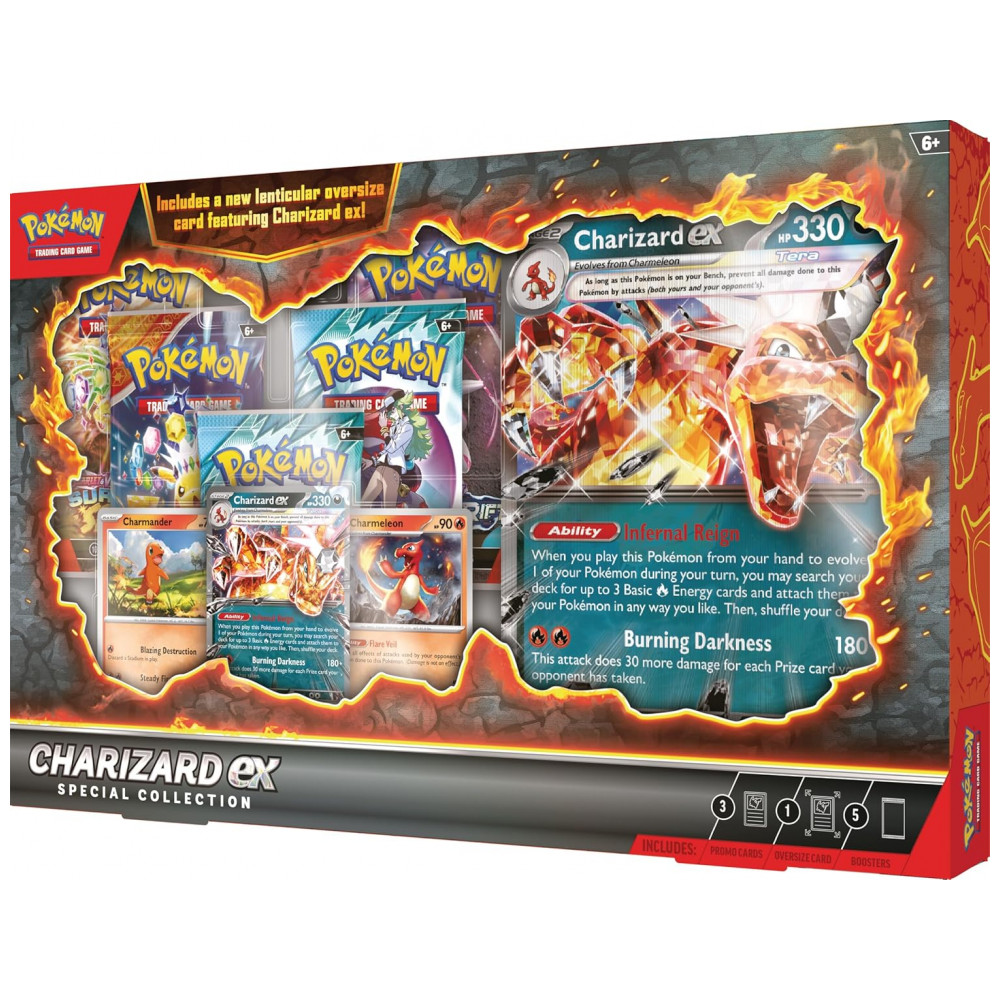 A coleção especial Pokémon TCG Charizard ex Special Collection é um conjunto temático desenvolvido para jogadores e colecionadores que desejam adicionar cartas promocionais de Charizard ex e de sua linha evolutiva à coleção. O produto inclui uma carta promocional etched foil de Charizard ex em tamanho padrão de jogo, adequada para uso em baralhos conforme as regras oficiais do Pokémon TCG.