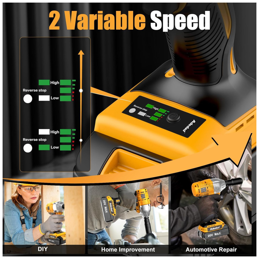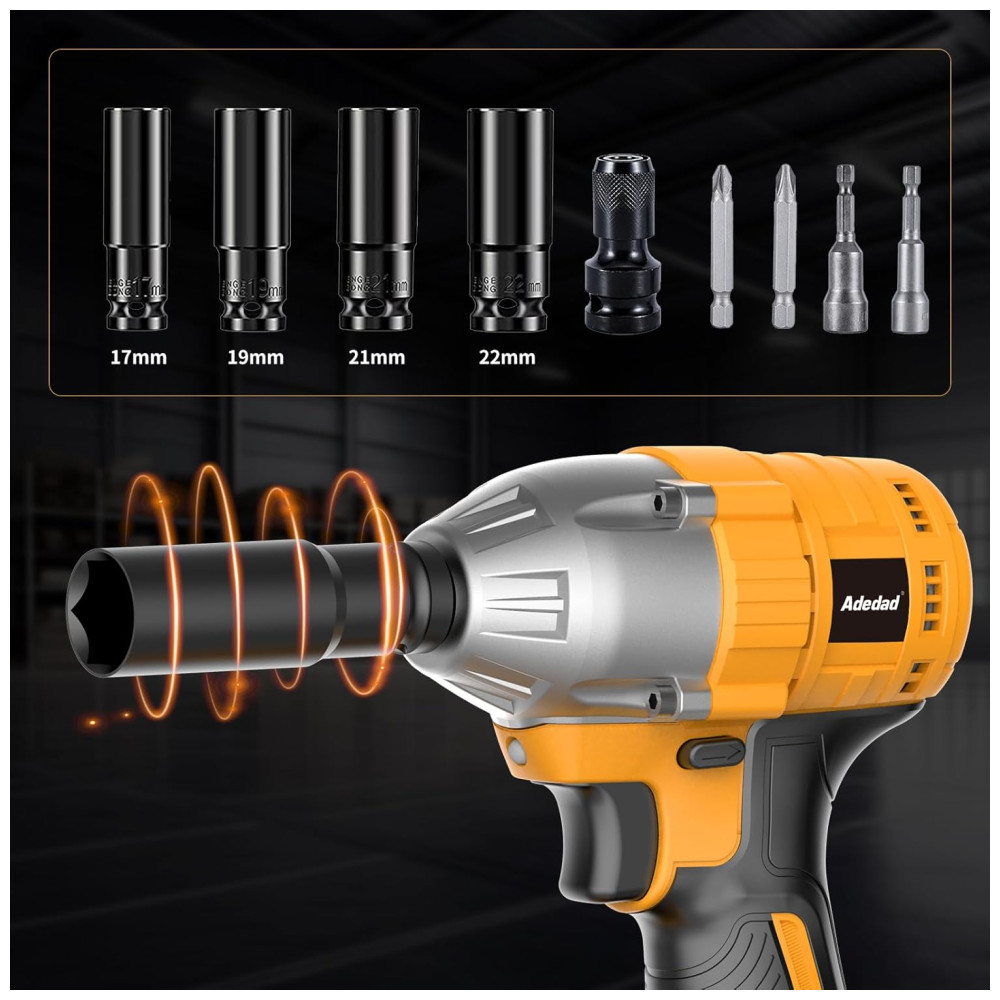 Chave de Impacto sem Fio 2 Velocidades com Carregador e Bateria de Li ion 2900 RPM 20V ADEDAD Amarelo