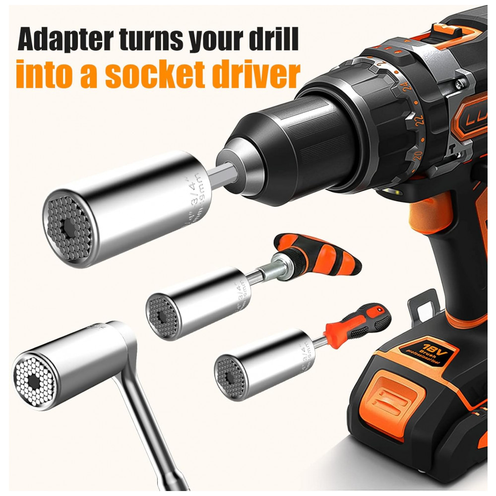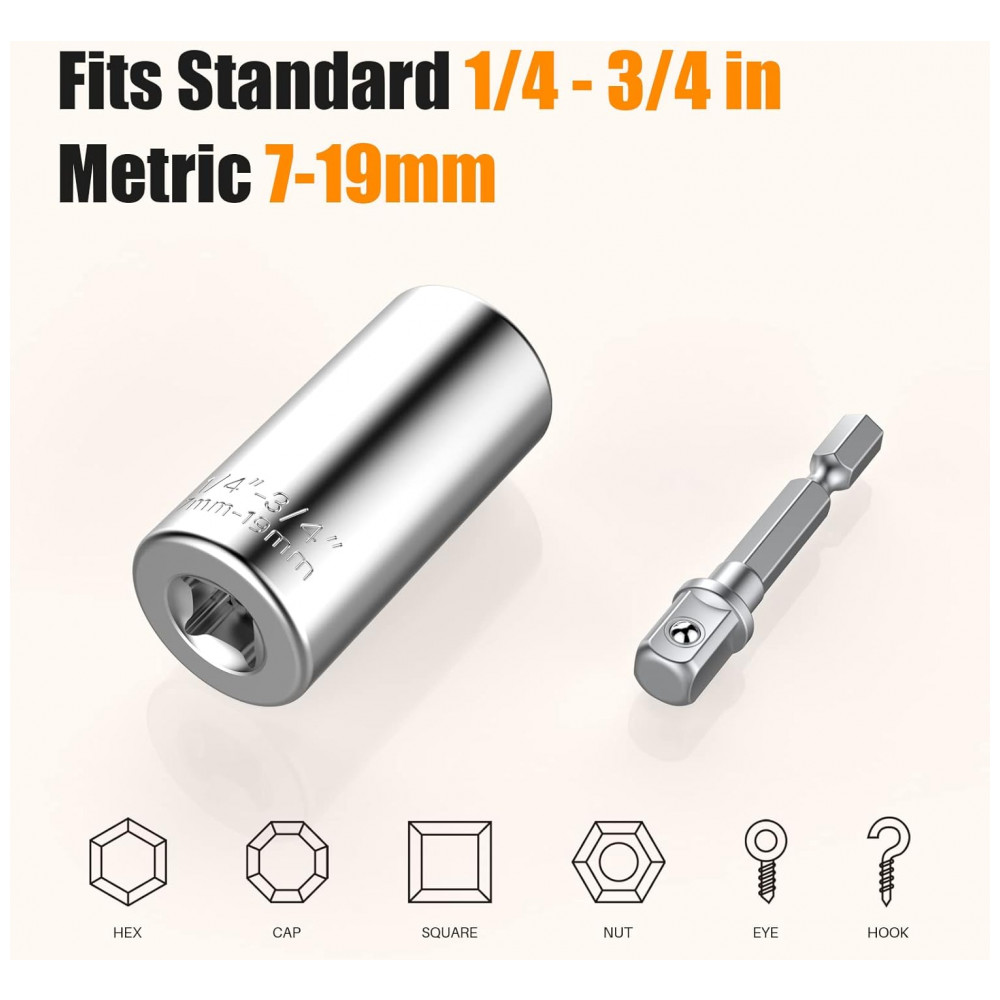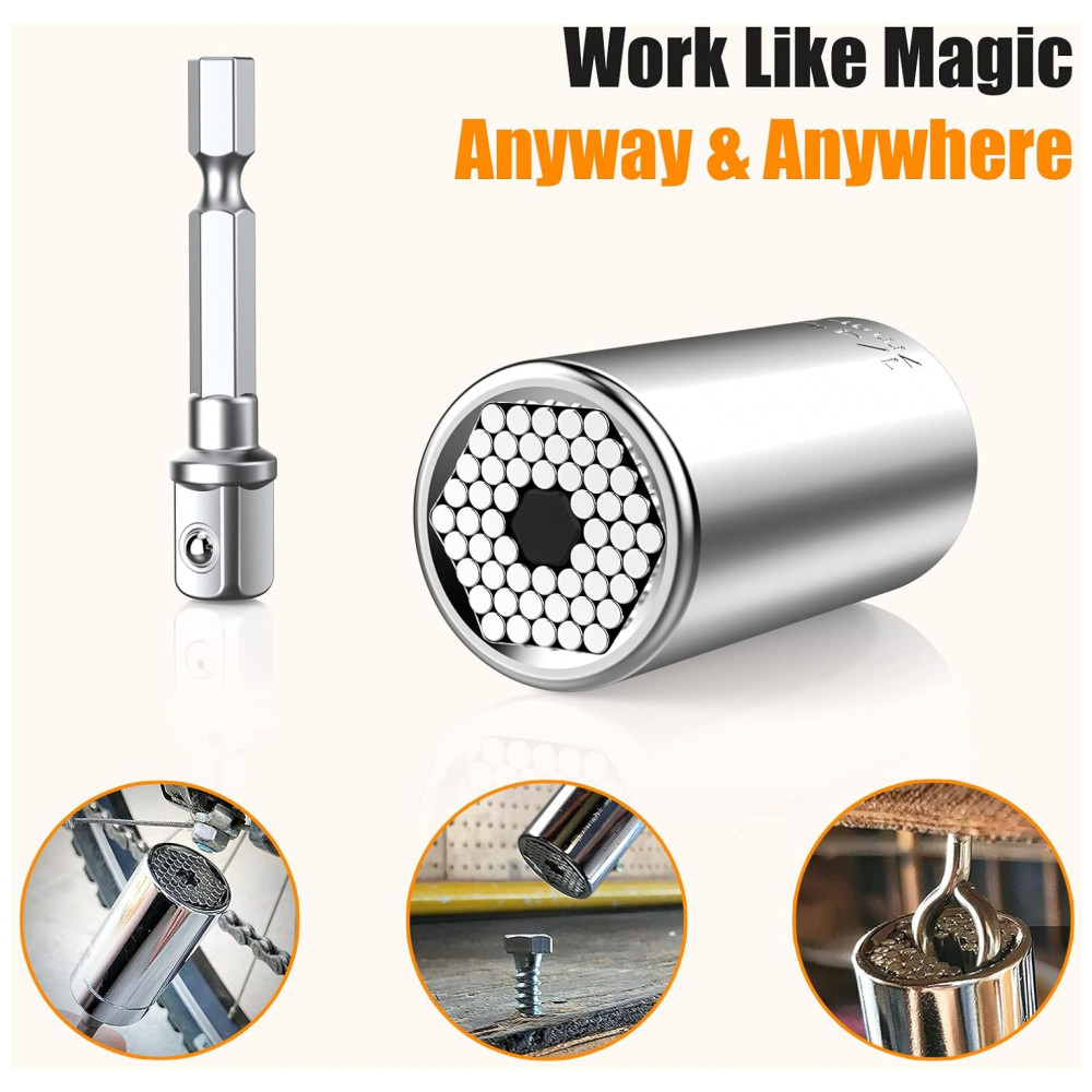 PROJETO ESPECIAL O design exclusivo se ajusta automaticamente a qualquer tamanho ou forma, adequado para parafusos padrão de 1, 4 a 3, 4 de polegada e parafusos métricos de 7 a , atendendo a todas as suas necessidades, compacto e fácil de transportar. CHAVE UNIVERSAL Pode ser ajustada imediatamente para apreender a maioria das métricas, porcas de orelhas, porcas quebradas, porcas com tiras, parafusos de olhal, porcas quadradas, hexágonos, etc. APLICAÇÃO LARGA Pode ser usada na indústria automobilística, manutenção doméstica, fabricação, construção e outras indústrias, também favorecidas pelos entusiastas do design de decoração para casa. MATERIAL ESPECIAL material de aço cromo vanádio durável, com 54 hastes de aço superfortes que são acionadas individualmente por mola, permitindo que o soquete se ajuste automaticamente a qualquer forma instantaneamente, mova se para diferentes tipos de fixadores sem precisar trocar os soquetes