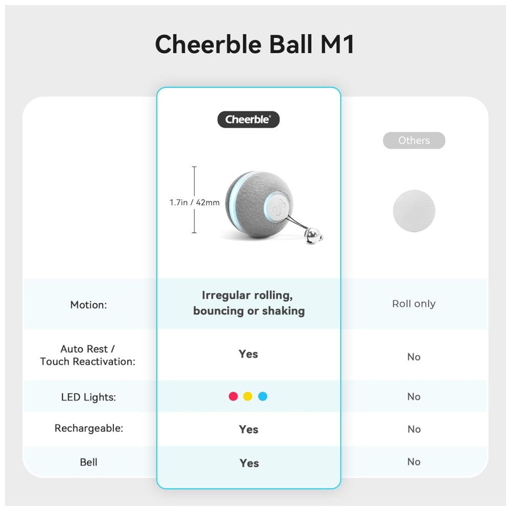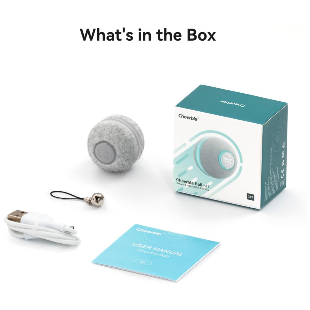 Brinquedo Bola Interativa Automática para Animal de Estimação Quando a Cheerble Ball está ativada, ela reage assim que seu gato a toca com o nariz ou as patas. Com luz cintilante, som baixo e rolando e pulando sozinha como um rato, a bola inteligente atrairá gatos para persegui la e capturá la. A bola será o brinquedo de interior preferido do seu gato.