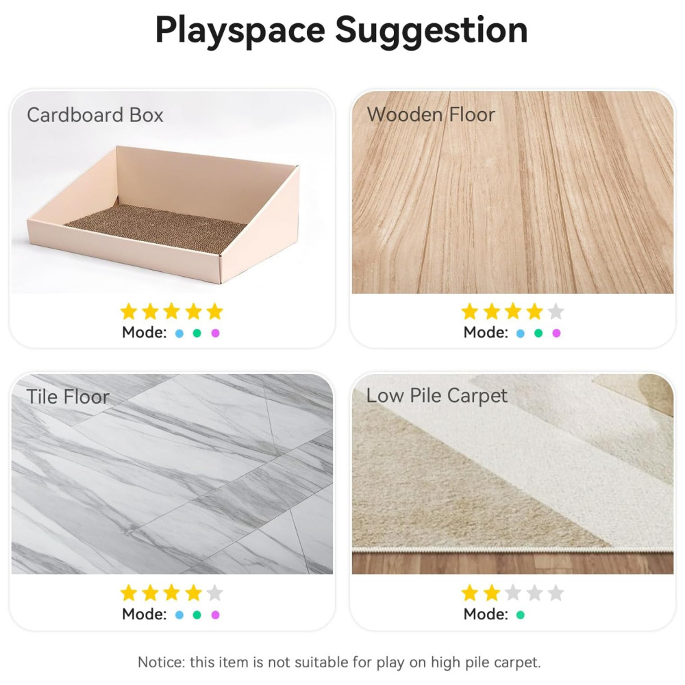Brinquedo de gato para evitar obstáculos inteligente Com um sensor automático de prevenção de obstáculos integrado inteligente, a Cheerble Ball se reverterá e se moverá quando atingir um obstáculo. Portanto, não há necessidade de se preocupar com a bola de brinquedo do gato ficar presa no canto.