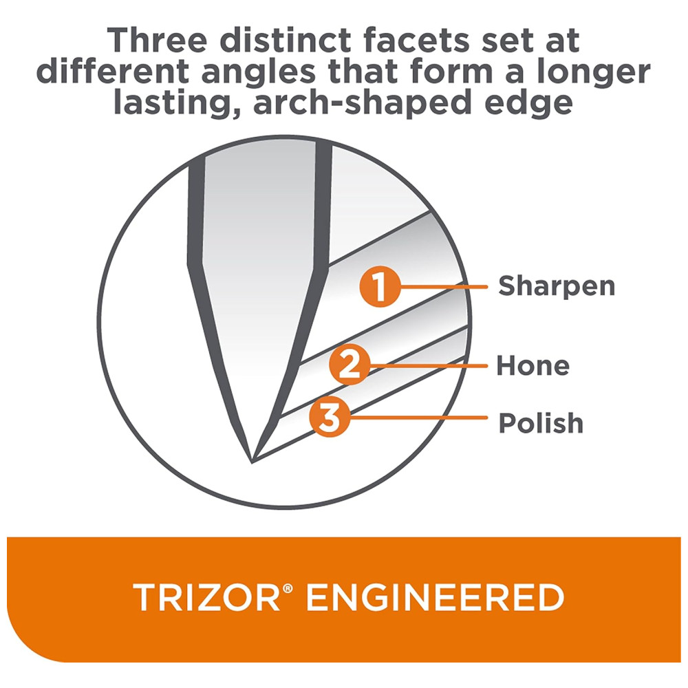Nítida O 15 Trizor XV combina a resistência e durabilidade da borda Trizor com a tecnologia 15 graus XV impecável e ultra nítida. O tempo necessário para afiar é de aproximadamente 1 minuto para afiar pela primeira vez e afiar de é de aproximadamente 10 segundos