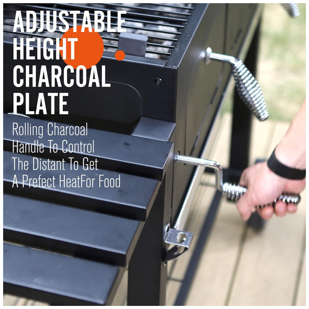 2 Alça de elevação nos lados esquerdo e direito, você pode rolar a alça para ajustar para cima e para baixo da bandeja de carvão para obter o calor desejado.