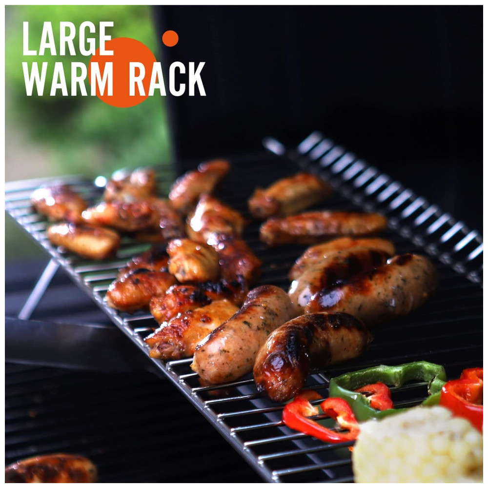 6 O medidor de temperatura montado na tampa indica a mudança de temperatura instantaneamente O design de dois amortecedores laterais aumenta o fluxo de ar ao máximo para queima eficiente e controle de temperatura, e a chaminé com uma tampa ajustável fornece fluxo de ar adicional
