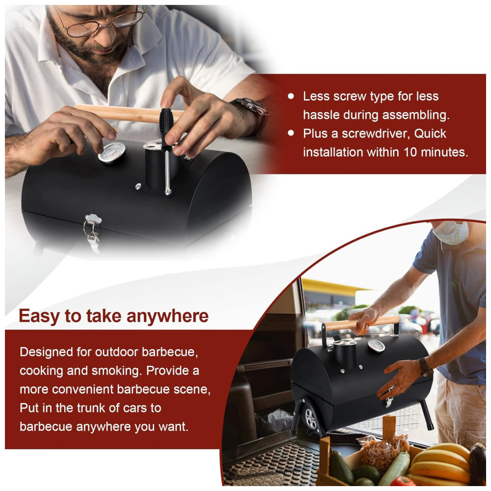 2 O design cilíndrico inovador tornou o portátil para colocar no porta malas dos carros para fazer churrasco em qualquer lugar que você quiser, ideal para churrasqueira ao ar livre, cozinhar no pátio, churrasco no quintal, pode ser montado com os manuais que vêm com o pacote em 10 minutos, menos tipos de parafusos, reduz o incômodo de combinar, além de uma chave de fenda para fácil montagem.