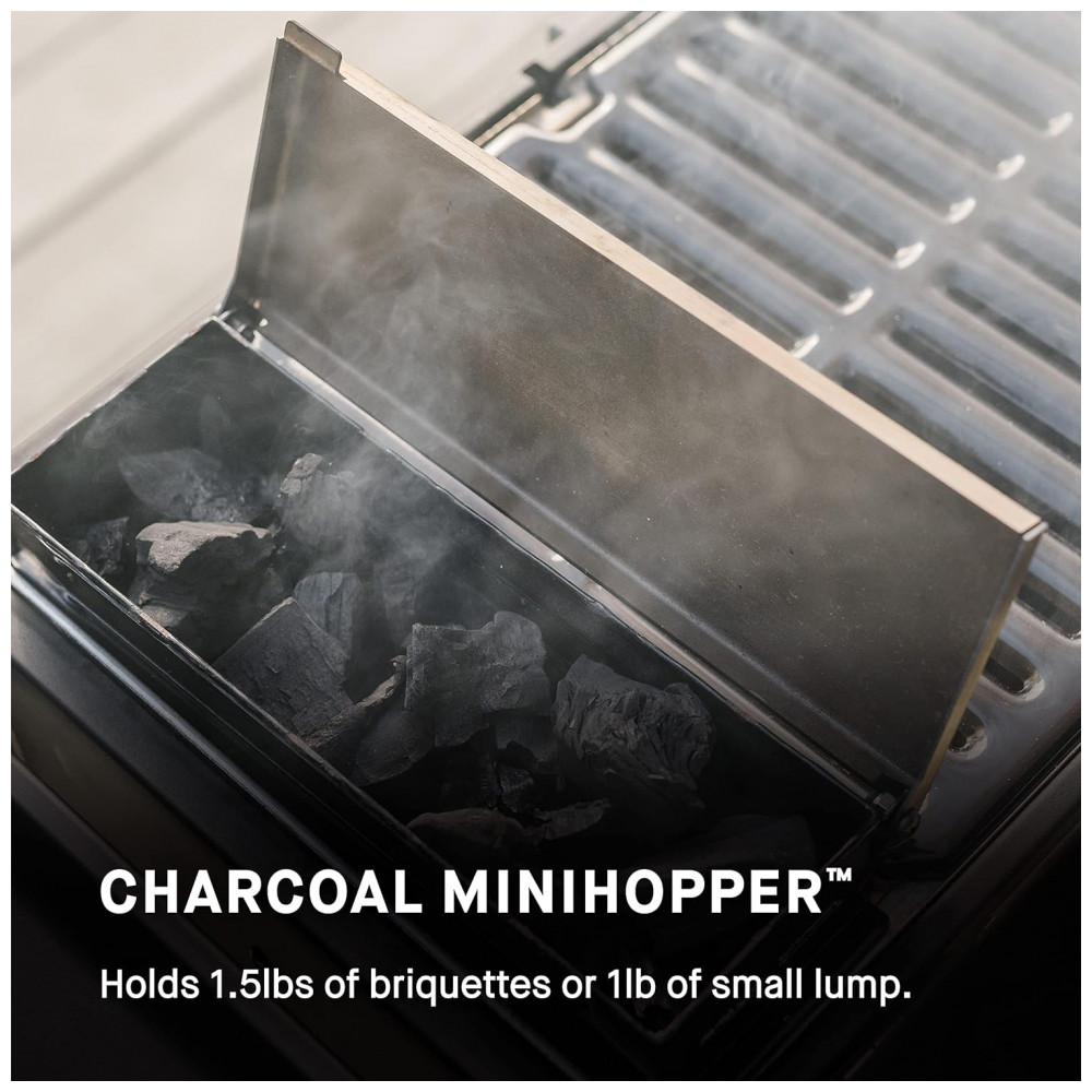 Carvão MiniHopper suporta 680g de briquetes ou 450g de pequenos pedaços por até 4 horas de uso