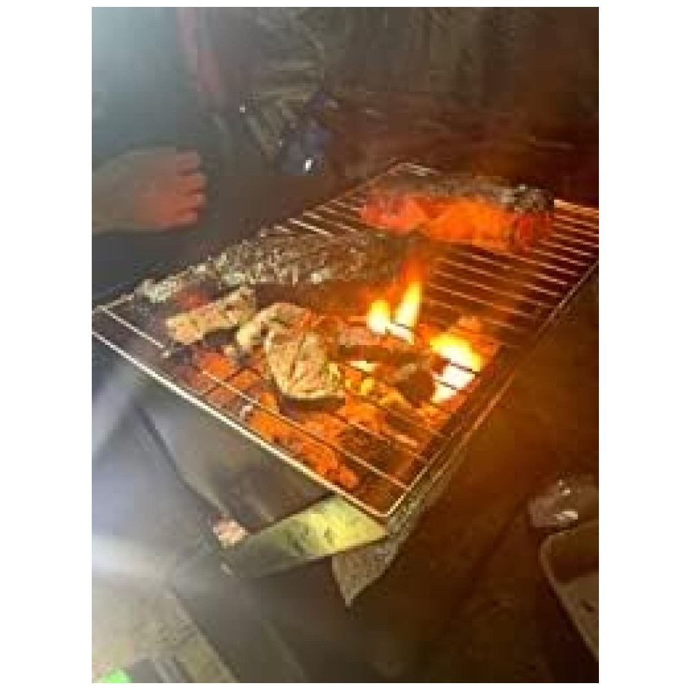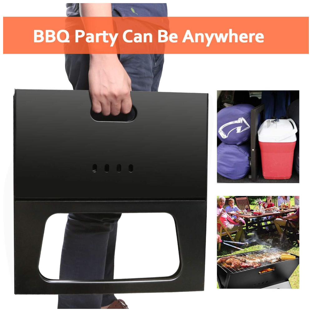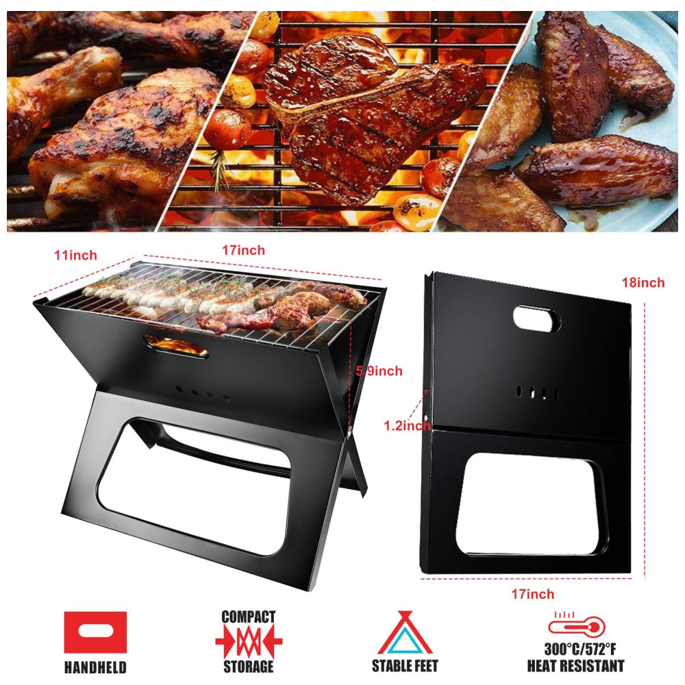 Materiais de aço inoxidável resistentes Churrasqueira a carvão dobrável ao ar livre construída em aço inoxidável de grau alimentício pintado de alta resistência ao calor que dificilmente fica enferrujado, não há necessidade de parafusos para montar e 8 aberturas úteis projetadas em cada lado, melhoram o fluxo de ar e a queima de carvão eficiente