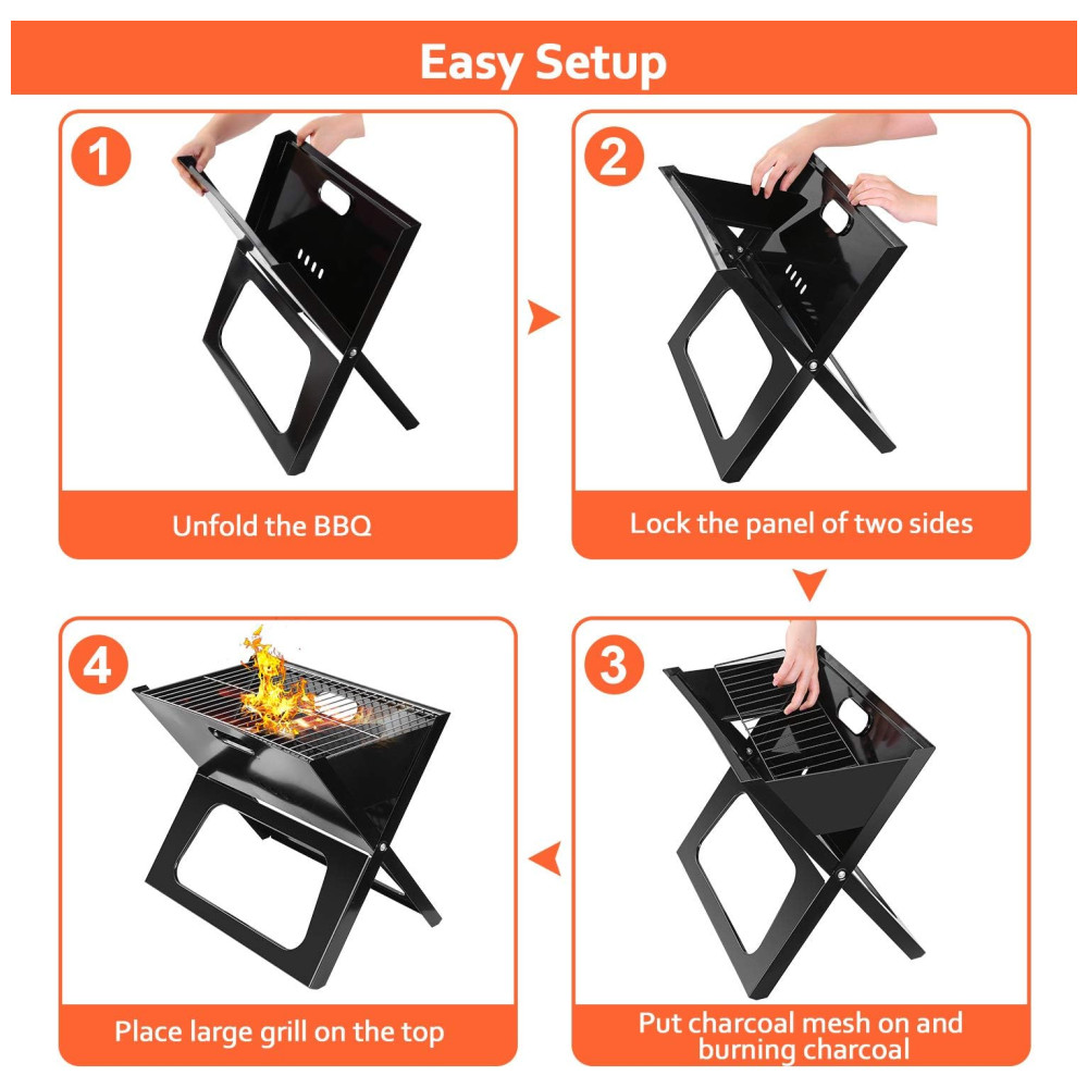 Design dobrável exclusivo e configuração fácil A configuração simples de duas etapas da churrasqueira portátil dobrável torna esta churrasqueira a carvão portátil obrigatória para grelhar em movimento, fácil transporte e zenamento, Quando a churrasqueira a carvão dobrável é desdobrada, a churrasqueira portátil a carvão forma um suporte triangular no chão para permanecer estável durante o uso