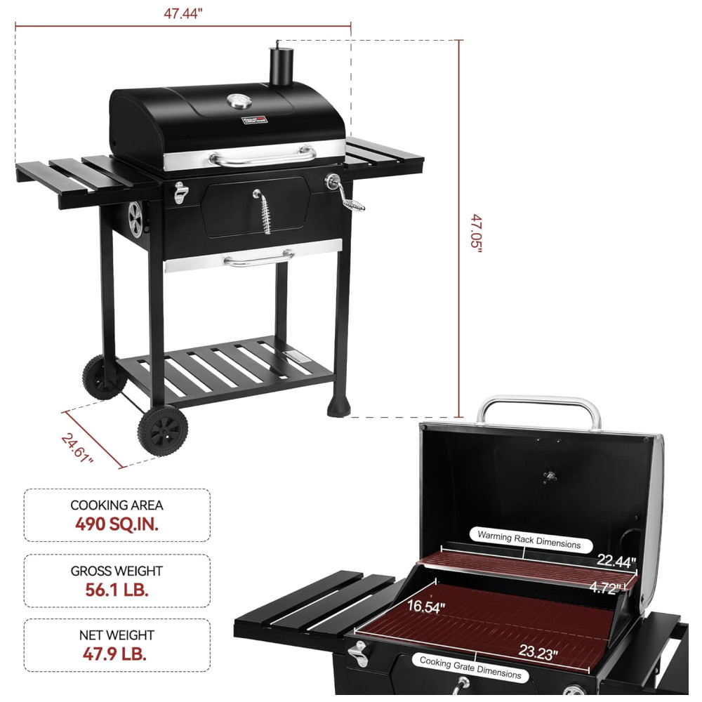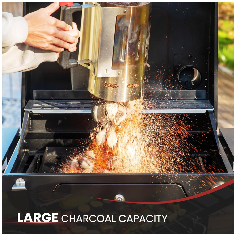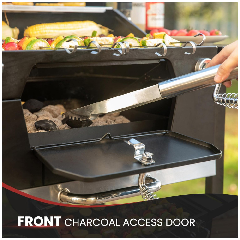 FÁCIL DE ADICIONAR CARVÃO E LIMPAR AS CINZAS Com a porta de acesso ao carvão na frente, o carvão pode ser adicionado rapidamente durante o cozimento. O cinzeiro removível galvanizado recolhe as cinzas e facilita o despejo.