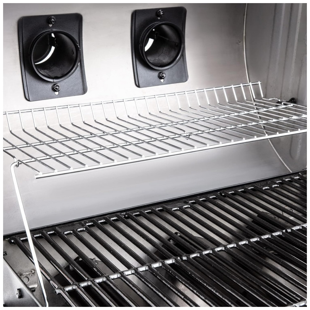 A Churrasqueira a Gás Char-Griller E3001 Grillin Pro oferece 438 polegadas quadradas de espaço para grelhar a gás, com 438 polegadas quadradas de área principal e 192 polegadas quadradas no rack de aquecimento. Os três tubos queimadores de aço inoxidável geram um total de 40.800 BTUs, incluindo um queimador lateral de 12.000 BTUs. A churrasqueira possui construção robusta em aço, grades de ferro fundido revestidas de porcelana, dois dutos para aquecimento uniforme, termômetro de aço inoxidável, alça do capô Stay Cool e ignição eletrônica em cada queimador. Esta churrasqueira a gás premium oferece 40.800 BTUs com 3 queimadores, tornando o churrasco excepcional em casa fácil. Os três queimadores com controles independentes proporcionam calor contínuo e equilibrado, enquanto a grande área de cozimento de 630 polegadas quadradas oferece ótimo sabor e aroma de churrasco. Construída em aço tubular resistente, possui dois dutos de fumaça para melhor ventilação, termômetro de churrasco em aço inoxidável, grelhas de ferro fundido revestidas de porcelana, carrinho com rodas grandes para fácil transporte, área de trabalho lateral com ganchos para utensílios de churrasco e design elegante em preto estilo barril com dutos de fumaça. Fácil de limpar com bandeja de gordura removível, acendimento eletrônico em cada queimador, e compatível com acessórios de churrasco Char-Griller como a capa de proteção e raspador de grelha. Dimensões: 122cm x 71cm x 122cm, 40kg.