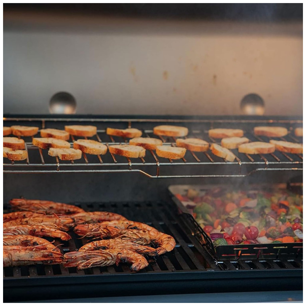 A grelha superior expansível cria um grande segundo nível de capacidade de grelhar para que você possa preparar uma refeição inteira de uma só vez.