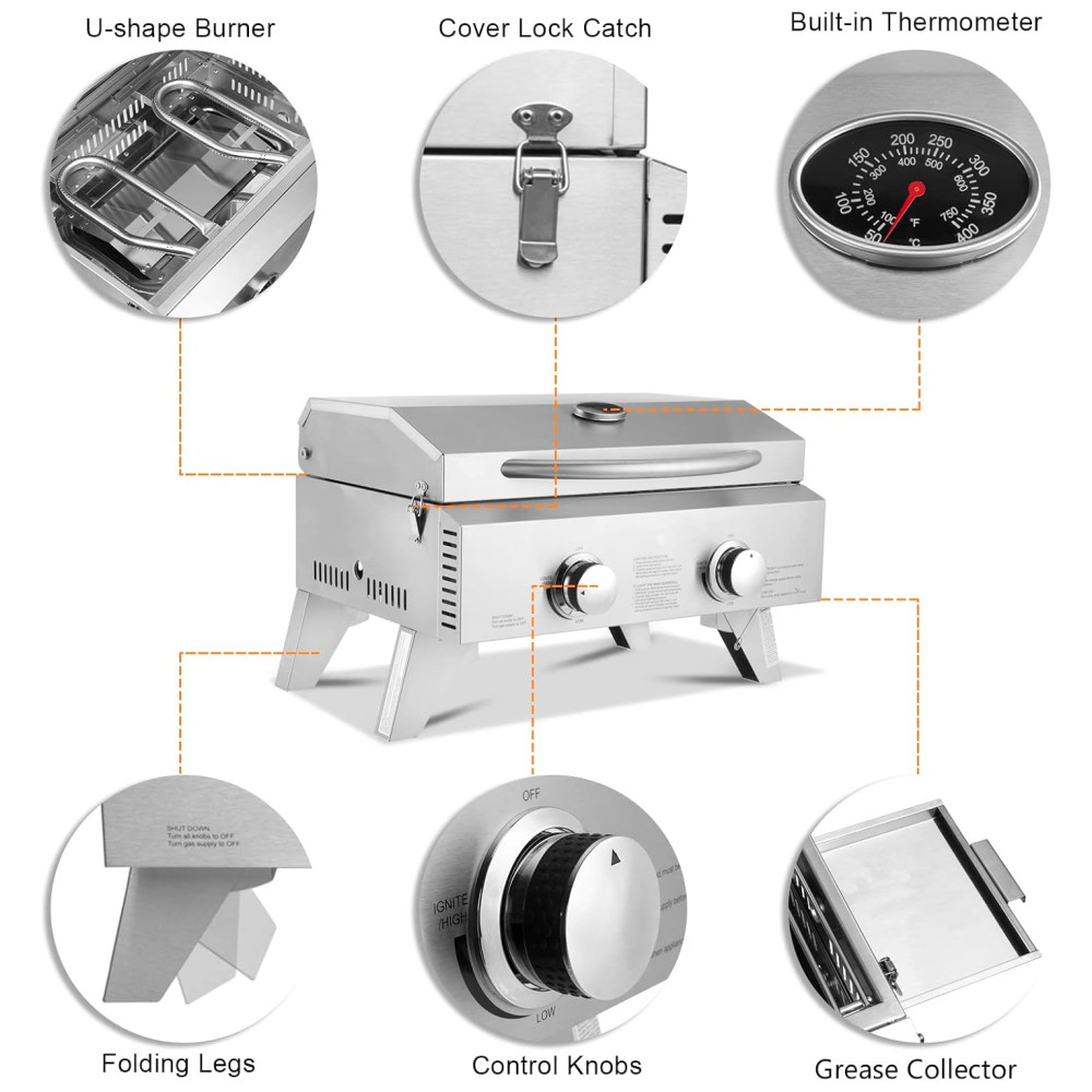 Dois Queimadores a opção de usar apenas um queimador, como normalmente grelhar para dois, é uma vantagem quando você faz churrasco ao ar livre. O queimador em forma de U fornece um calor máximo de 10.000 BTU e