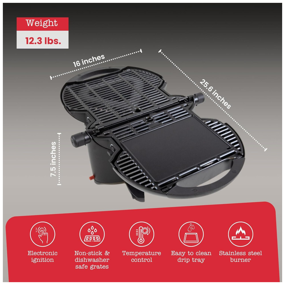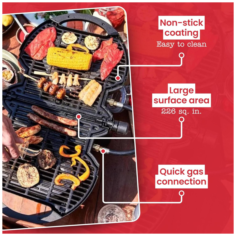 GRATAS ANTI STICK COM REVESTIMENTO DE CERÂMICA DE Com uma enorme área para cozinhar, esta churrasqueira a propano portátil tem espaço suficiente para grelhar todos os seus alimentos favoritos, distribuindo o calor de maneira uniforme e eficiente. As grades são facilmente removíveis, SEGURAS PARA MÁQUINAS DE LAVAR LOUÇA e resistentes à ferrugem.