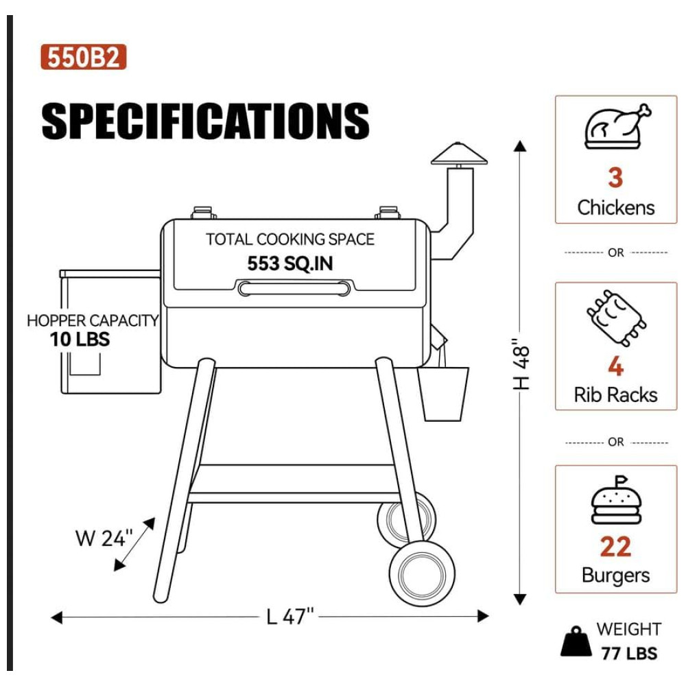 Com 8 em 1 de versatilidade, a grelha permite assar, grelhar, fumar, churrasco, assar, refogar, churrasco e grelhar, capacitando você a experimentar várias técnicas culinárias para criar refeições deliciosas que atendam às suas preferências de gosto. Com rodas AllTerrain e alça de elevação, alça lateral, a churrasqueira é portátil e fácil de mover. Possui 553 m de área de cozinha, capacidade de depósito de 4,54 quilos e peso de 34,92 quilos, sendo perfeito para casais e famílias pequenas.