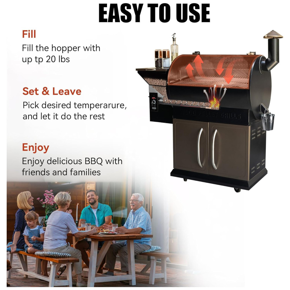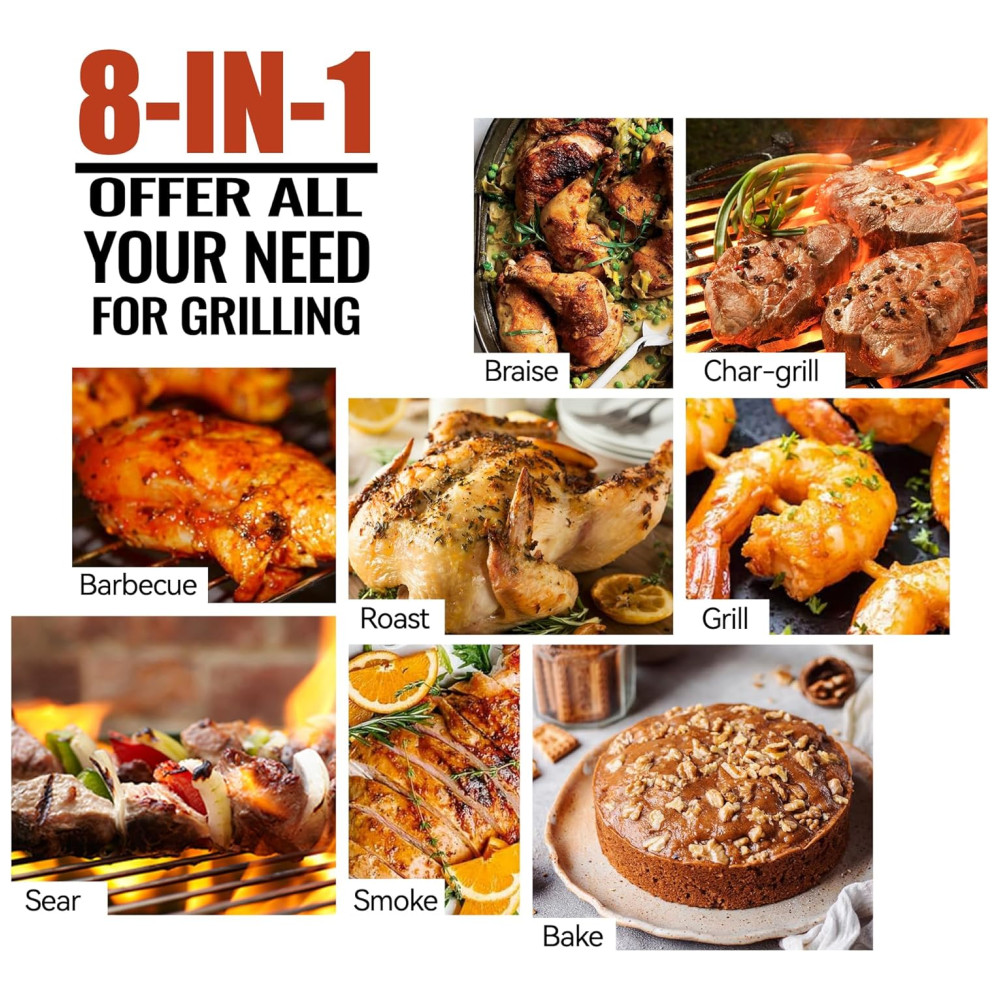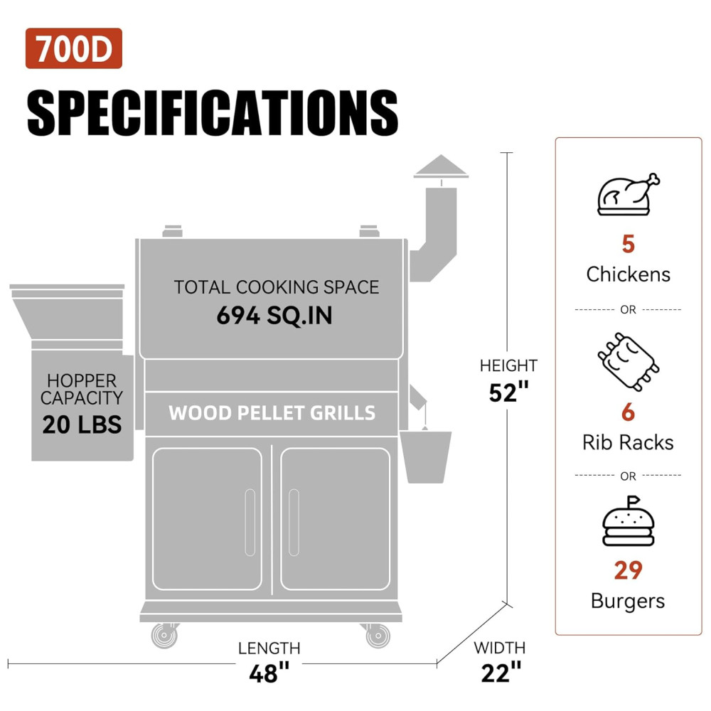 Esta grelha a pellets é construída em aço com acabamento em pó de alta temperatura, tornando a duradoura e robusta. Com um enorme espaço de cozinha de 700 centímetros ao quadrado , ela pode acomodar até 30 hambúrgueres, 6 costelas ou 5 frangos sem esforço, sendo ideal para uso em casa, festas e eventos.