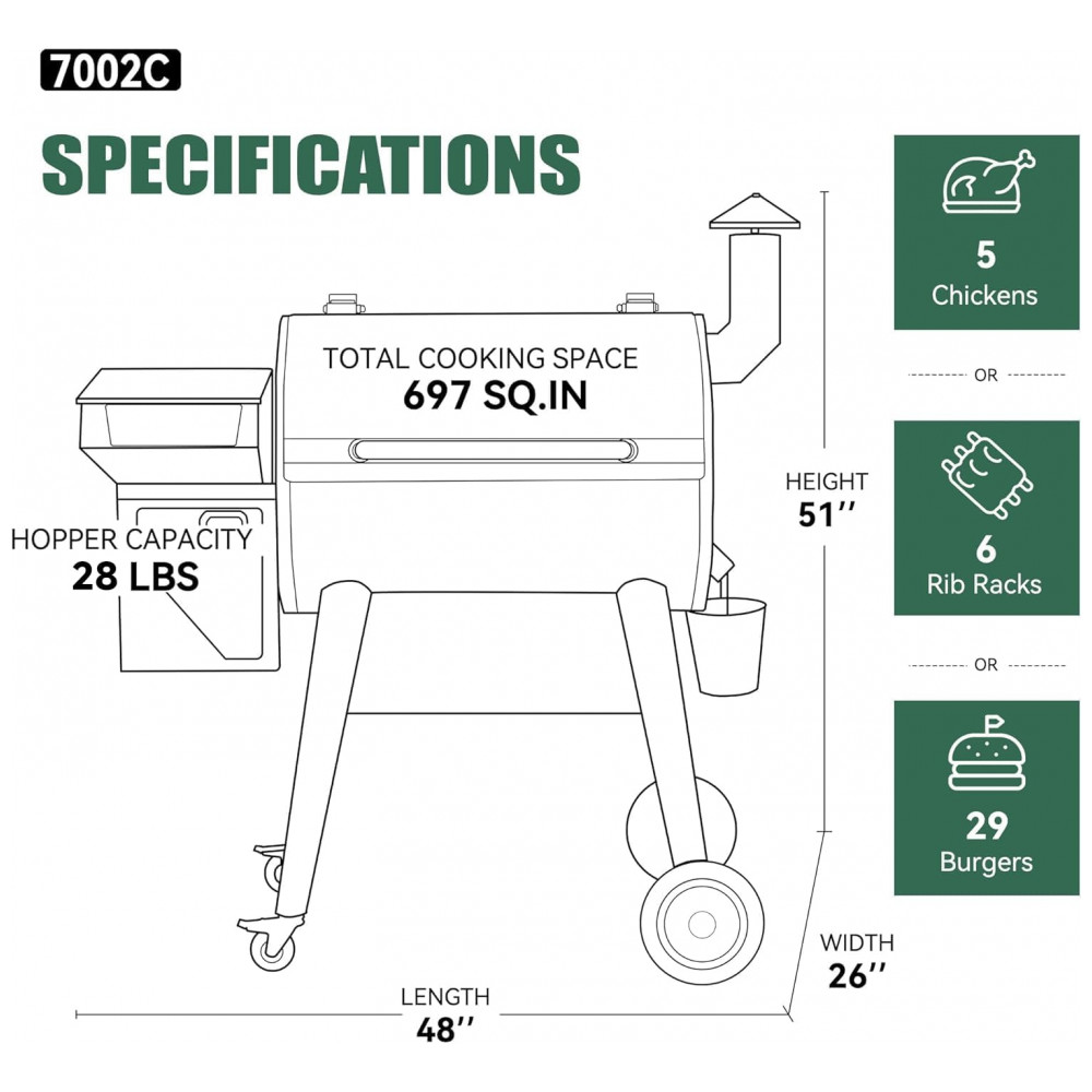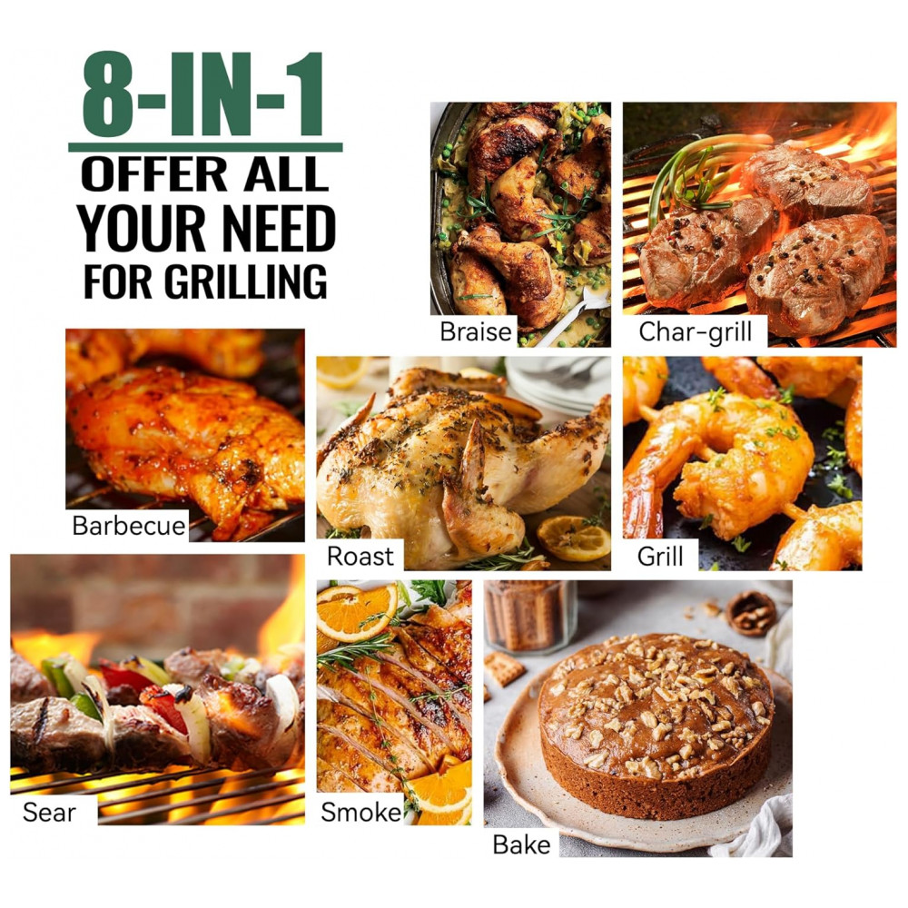 A grelha de pellets apresenta a tecnologia PID 2.0, que conta com uma tela LCD para ajuste automático de combustível e fluxo de ar, garantindo consistência de temperatura apesar de variações significativas de temperatura externa. Com uma capacidade enorme de espaço para grelhar, é ótima para casa, festas e utilização não autorizada. O funil de pellets de grande capacidade oferece um tempo de cozimento mais longo. A construção robusta em aço com acabamento em pó para alta temperatura torna a grelha de pellets duradoura. A grande tela LCD com 2 sondas de carne incluídas tornam o processo de fumo mais fácil, basta configurá lo e deixá lo funcionar, sem cuidar da churrasqueira. É possível monitorar convenientemente o fornecimento de pellets sem ter que levantar a tampa com a janela de visualização. A limpeza do funil torna muito fácil esvaziar o reservatório e trocar os sabores dos pellets, preparando se para infundir sua comida com um rico sabor de fumaça. A mobilidade superior da grelha de pellets é garantida pelas 2 rodas robustas que conquistam facilmente qualquer terreno de quintal, enquanto os 2 rodízios com travas promovem um rolamento suave e fixam a churrasqueira no lugar.