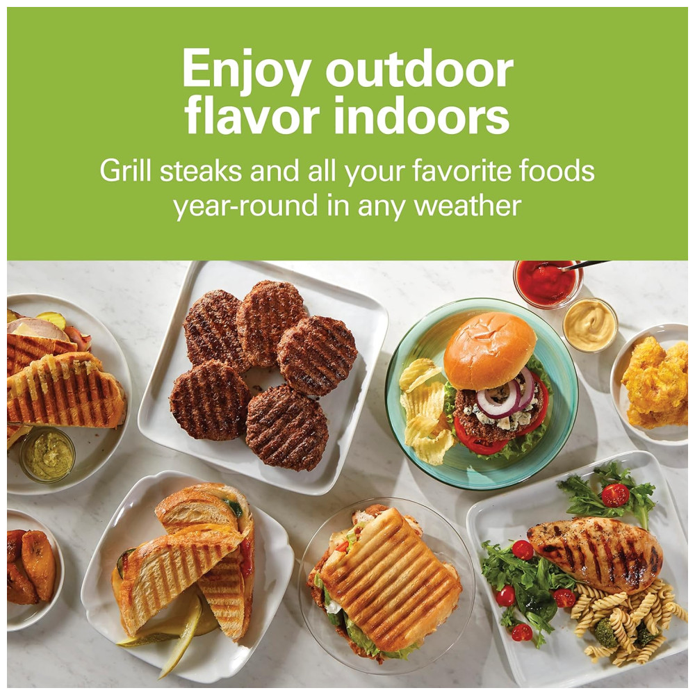 Grelha até 6 hambúrgueres ou 4 bifes grandes é perfeita para refeições em família e pode ser facilmente limpa com uma superfície antiaderente.