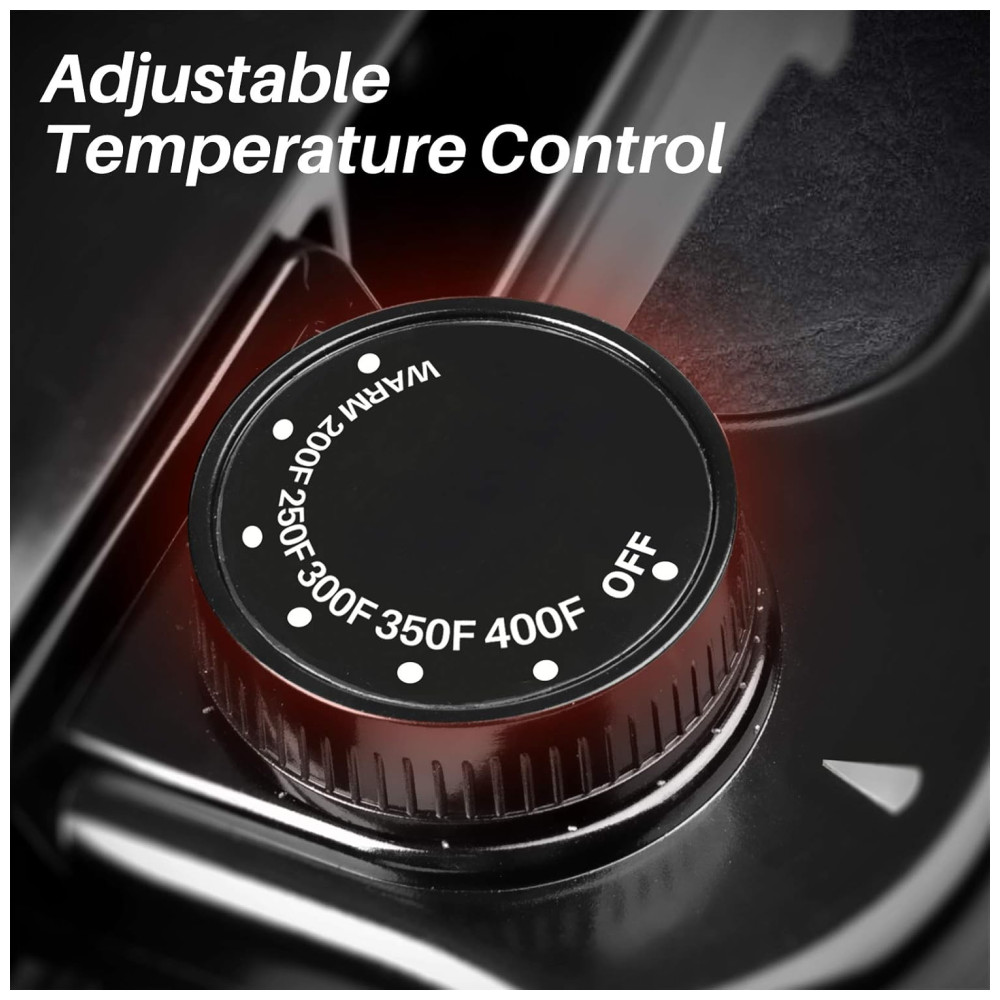 A tampa de vidro removível evita respingos e retém o calor aberturas de umidade extras nas laterais que mantêm os alimentos crocantes durante o churrasco.