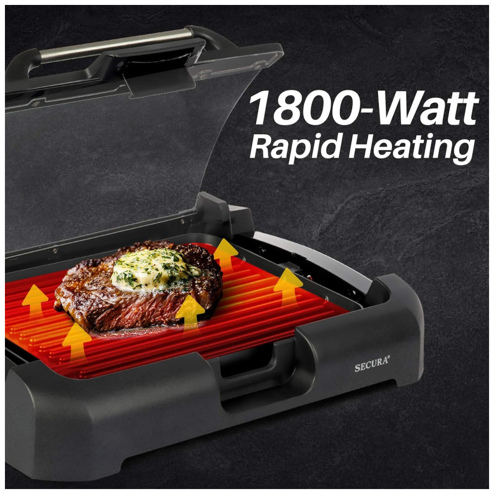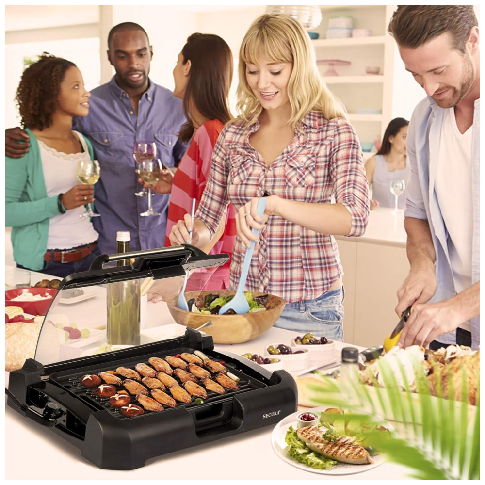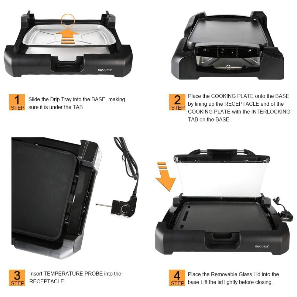A grelha elétrica portátil Secura tem uma placa de cozimento reversível e antiaderente medindo38 x , cerca de 16.7 m2 uma superfície de cozimento super grande economiza tempo de cozimento e permite a movimentação fácil dos alimentos enquanto você grelha ou faz um churrasco.