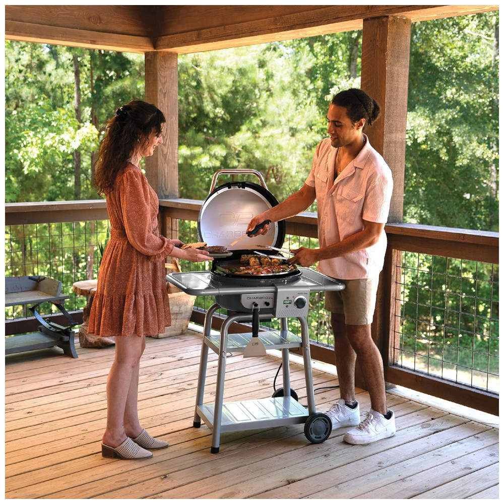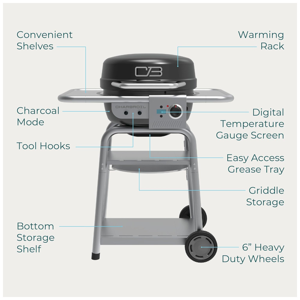 Procurando por uma solução de grelhados eficiente em espaço que faz um pouco de tudo, sem sacrificar o sabor? Cozinhar ao ar livre de forma fácil, deliciosa e versátil nunca foi tão simples para novatos ou especialistas em grelhados. A Churrasqueira Elétrica Char-Broil Bistro Pro com Grelha e Grill no Modo Carvão é a churrasqueira definitiva para espaços pequenos, apresentando nosso dinâmico sistema de cozimento Electric2Coal, que permite alternar entre grelhados elétricos e a carvão. Com sua alta temperatura máxima, esta churrasqueira elétrica oferece infinitas possibilidades de grelhados, desde suculentos hambúrgueres a bifes selados, panquecas fofas e ovos. Alimentada pelo sistema elétrico dinâmico Electric2Coal, esta churrasqueira elétrica pode se transformar facilmente em uma churrasqueira a carvão para os dias em que você deseja aquele sabor defumado extra. Adicione pedaços de madeira à grelha de carvão para obter ainda mais sabor de fumaça. Alcance facilmente temperaturas de selagem, totalmente alimentado pela eletricidade. Independentemente das restrições de espaço ou do tamanho do seu espaço externo, esta churrasqueira compacta será o ajuste ideal e uma elegante adição. A grelha de aço inoxidável incluída pode cozinhar café da manhã, almoço ou jantar para toda a família, e ainda é pequena e leve o suficiente para lavar facilmente na pia da cozinha. Aproveite o cozimento principal para grelhar até 12 hambúrgueres de uma vez. Multitarefa facilmente e use a grelha de aquecimento para cozinhar com calor indireto ou manter sua comida aquecida. Esqueça a complicação do propano, incluído é um cabo que se conecta perfeitamente a uma tomada de 110 volts. Aproveite a tela de temperatura digital fácil de ler para monitorar a temperatura de cozimento a cada passo do caminho. Ao mudar os modos de cozimento, nossos refletores de calor patenteados reposicionam dinamicamente para garantir um desempenho de calor ideal. Cada grelha é projetada para reduzir os flare-ups e é revestida de porcelana para reter o calor e cozinhar a comida uniformemente, produzindo resultados mais suculentos. Desfrute do benefício de uma churrasqueira em tamanho normal com duas prateleiras laterais e uma prateleira intermediária para manter seus ingredientes, utensílios e ferramentas organizados e sempre à mão.