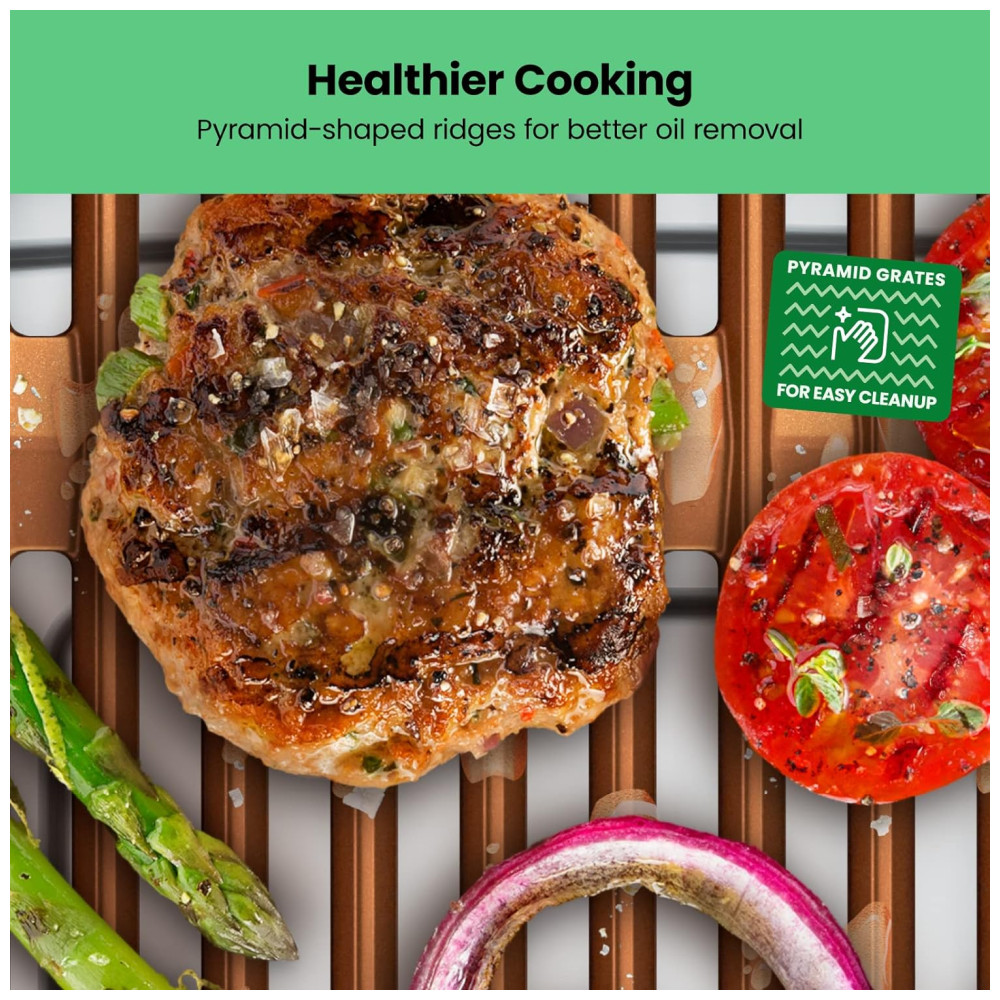 O Grill Elétrico Interno Sem Fumaça da Chefman com Revestimento de Cobre transforma seu churrasco no quintal em uma culinária de alta qualidade na cozinha. A bandeja de gotejamento cheia d’água permite grelhar quase sem fumaça dentro de casa e o calor controlado por temperatura prepara o jantar do jeito que você gosta. Faça refeições para um grande grupo com a área de cozimento extra grande e mantenha a limpeza simples com a grelha antiaderente e a base e bandeja de gotejamento próprias para lava-louças. Aprovado pela UL, com tecnologia avançada de segurança para durabilidade de longa duração. Para informações sobre como usar o produto, consulte o Guia do Usuário em PDF.