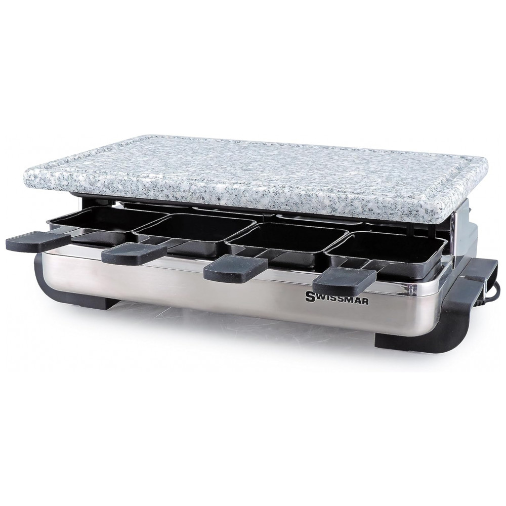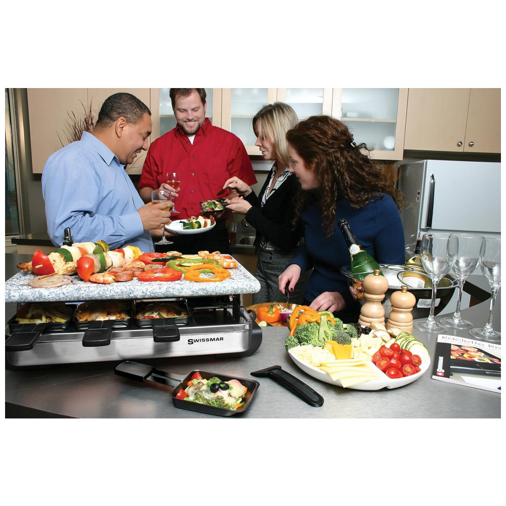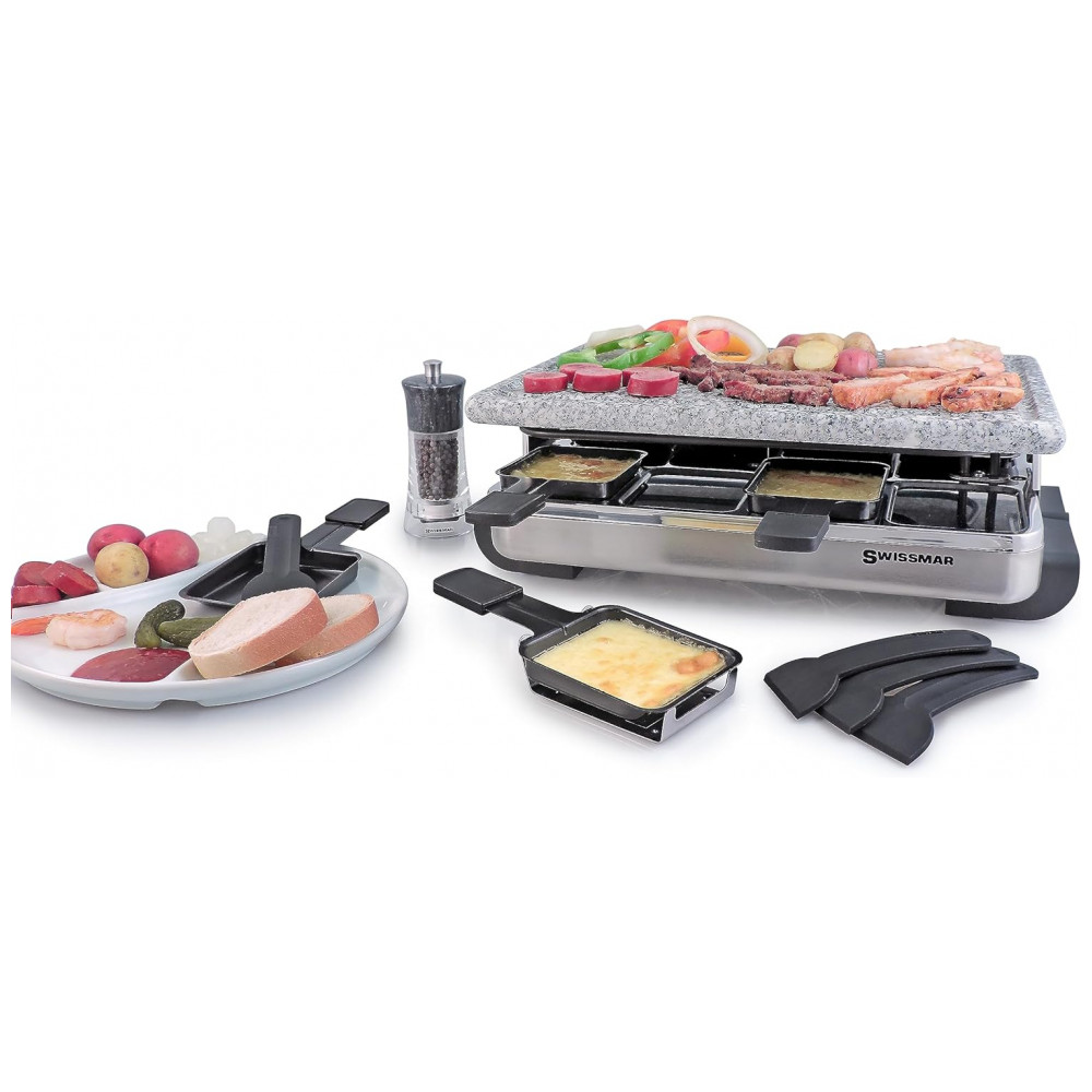 Inclui 8 espátulas resistentes ao calor e 8 pratos raclette com revestimento antiaderente