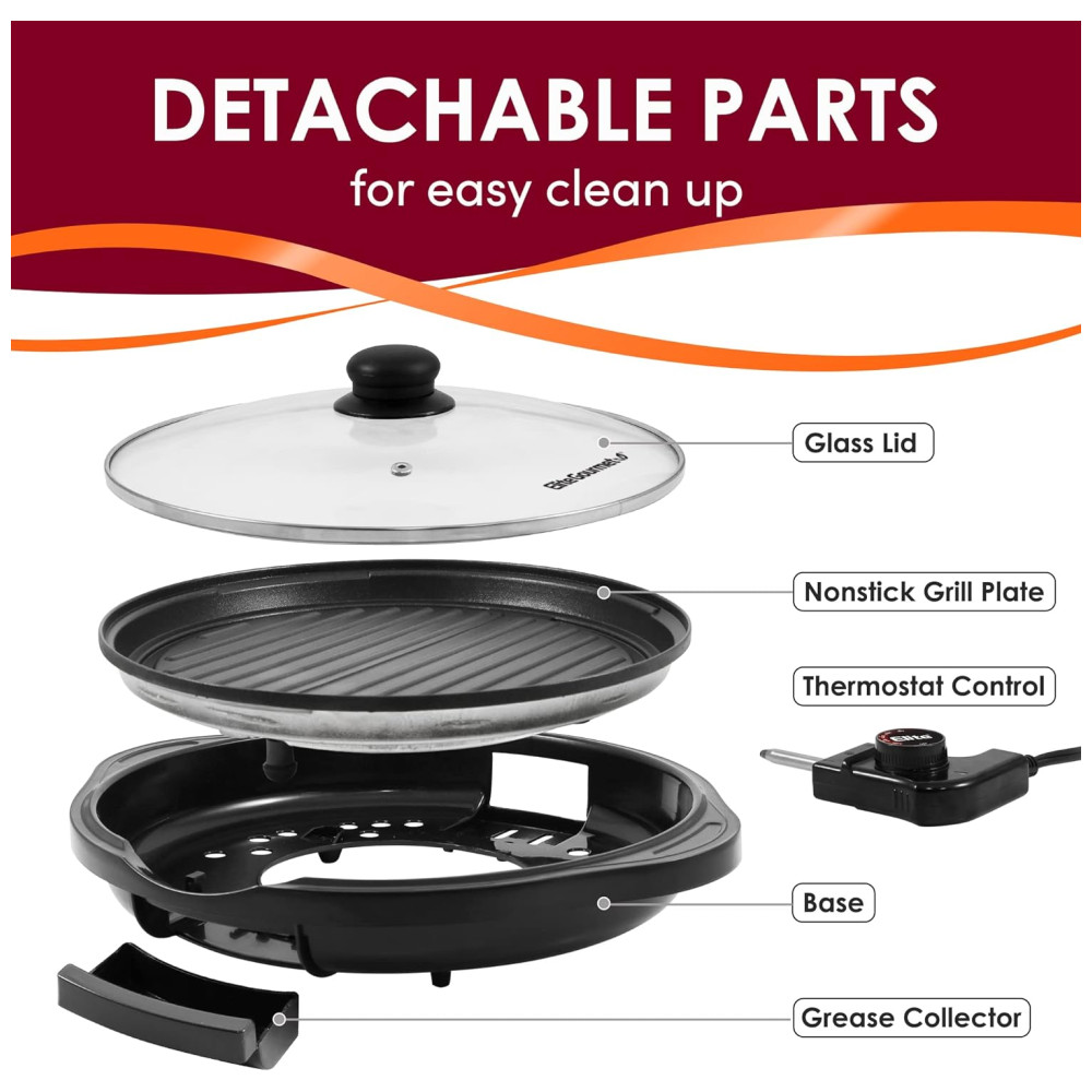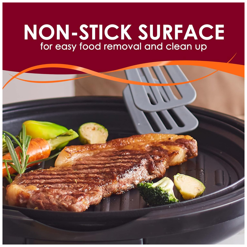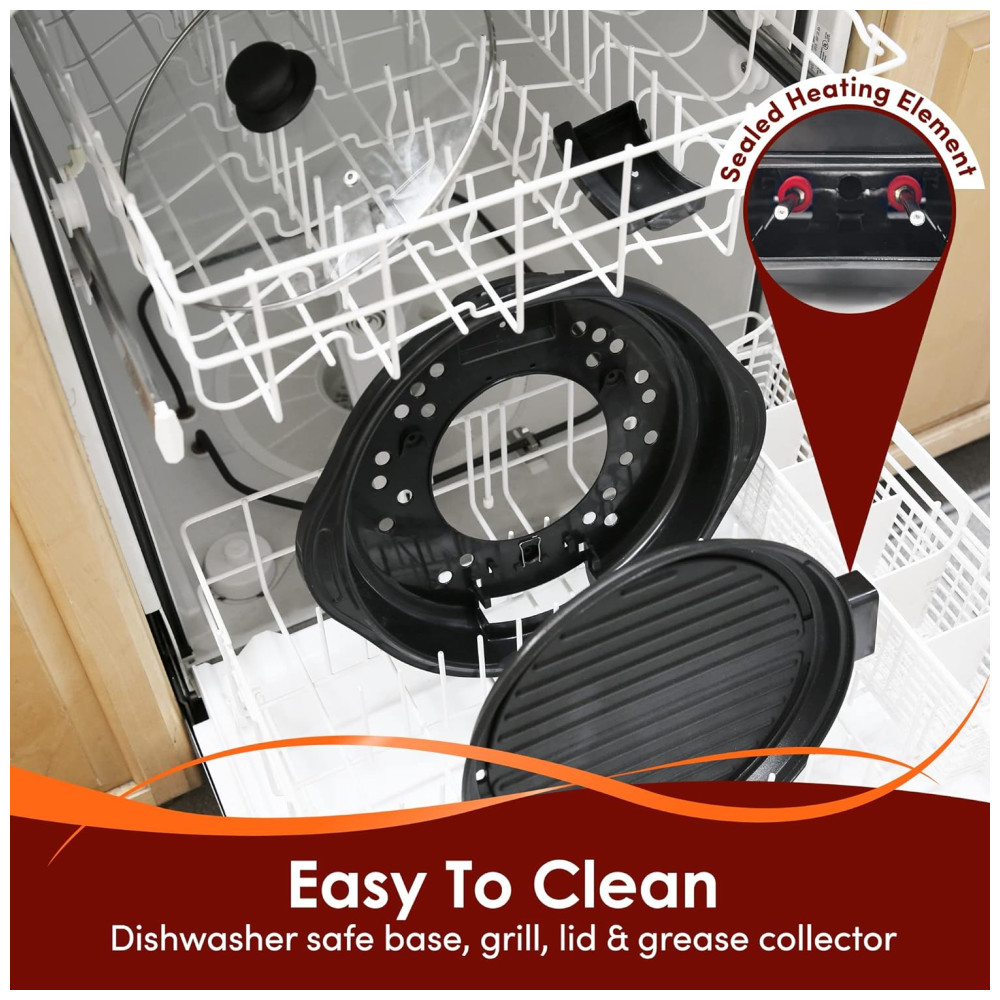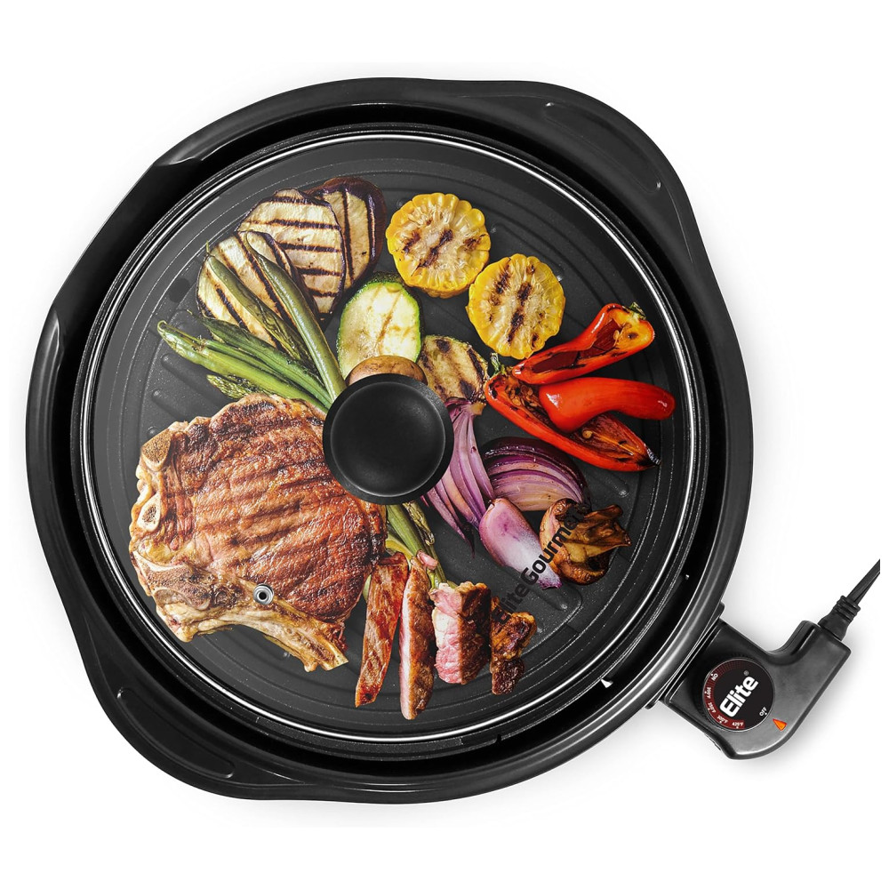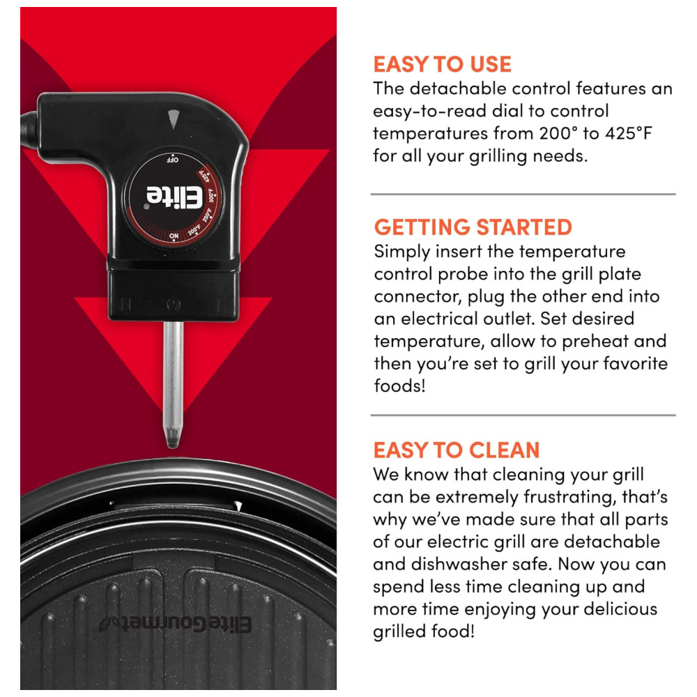 Apresentamos a Churrasqueira Indoor que mamãe e papai vão adorar usar e limpar! Rápida, fácil, conveniente e divertida para curtir seus bifes ou legumes grelhados favoritos, até em dias chuvosos. Agora você pode saborear costeletas de porco, costelas, bifes, asinhas de frango, legumes e peixes deliciosos durante todo o ano, sem depender do sol! Basta ligar sua churrasqueira elétrica indoor antiaderente e começar a grelhar! Mesmo se você não for um mestre churrasqueiro, pode usar nossa churrasqueira indoor facilmente e com segurança, graças à base e alças resistentes ao calor! Inclui uma tampa de vidro temperado para monitorar a comida com facilidade! A ampla superfície antiaderente ajudará você a economizar tempo e esforço, grelhando todos os seus alimentos de uma vez! Refeições mais rápidas e saudáveis para sua família e amigos! Todos vão adorar suas famosas costeletas ou bifes com uma churrasqueira que aquece rapidamente e proporciona resultados saborosos. Nosso elemento de aquecimento circular aquece a superfície de grelhar em um piscar de olhos, para que você possa desfrutar das refeições mais rapidamente! Limpeza facilitada! Nossa churrasqueira elétrica indoor possui peças removíveis que podem ir à lava-louças, tornando a limpeza tão fácil quanto 1, 2, 3! Procurando o presente de casa ideal para seus entes queridos? Surpreenda-os com nossa churrasqueira indoor premium de 11 polegadas, para que possam desfrutar de refeições deliciosas e com baixo teor de gordura todos os dias! Aproveite as diversões de um churrasco ao ar livre no conforto de sua casa com nossa churrasqueira elétrica premium indoor. Prepare as refeições gourmet no estilo churrasco mais suculentas e deliciosas para sua família, dentro de casa! Economize tempo grelhando todos os seus alimentos favoritos dentro de casa! Agora você pode grelhar bifes, legumes, costelas ou seu corte favorito de salmão na superfície de 11 polegadas! E graças ao revestimento antiaderente confiável, você nunca mais terá que lidar com alimentos grudando! Além disso, há um controle de termostato removível de 120V a 1400W com ajustes até 425°F. Desfrute de receitas saudáveis com pouco teor de gordura sem esforço! A churrasqueira indoor Elite Gourmet possui um elemento de aquecimento circular que permite aquecer mais rápido e de forma mais uniforme, para que você possa cozinhar tudo à perfeição! A gordura escorrerá dos seus alimentos através dos canais de grelhar, e alças de base com toque frio ajudam a evitar queimaduras desagradáveis! Peças laváveis na lava-louças! Sabemos que limpar a churrasqueira pode ser extremamente frustrante, por isso garantimos que todas as peças de nossa churrasqueira elétrica são removíveis e podem ser lavadas na lava-louças, exceto a sonda de temperatura removível. Agora você pode passar menos tempo limpando e mais tempo desfrutando de suas deliciosas refeições grelhadas!