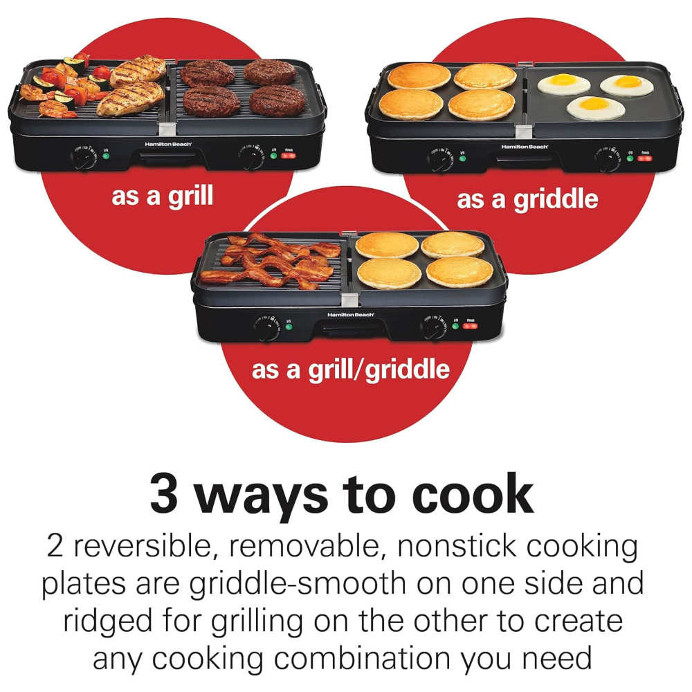 Versatilidade de cozimento 3 em 1 grelha completa, grelha completa, meia grelha , meia grelha. As placas reversíveis incluem uma grelha de um lado e uma grelha do outro.