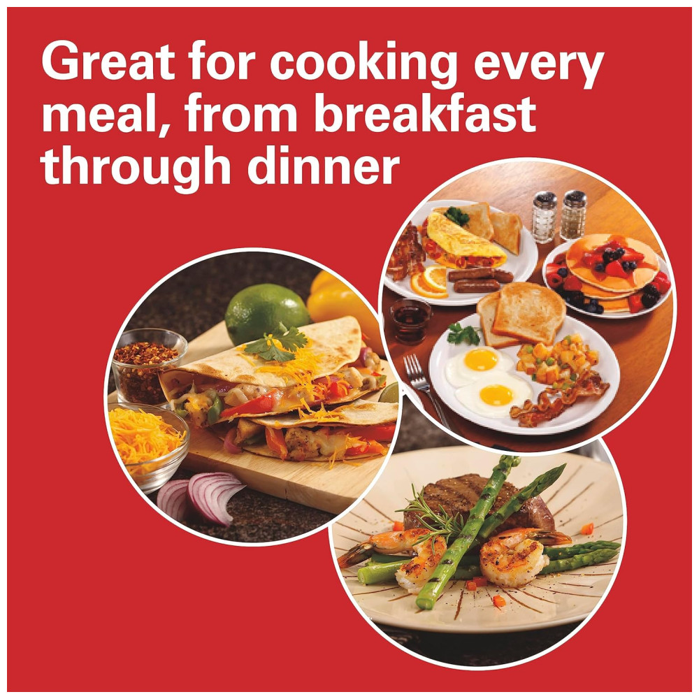 Ótimo para café da manhã, almoço e jantar desde panquecas, ovos e bacon no café da manhã, a queijo grelhado e sanduíches quentes para almoço a bifes grelhados, hambúrgueres, frango, peixe, pizza, legumes e muito mais, pode ser para qualquer refeição.