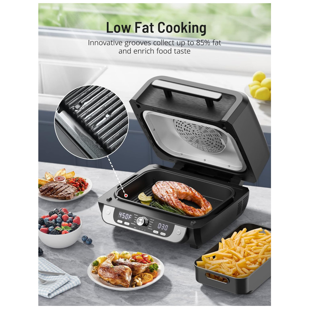 SISTEMA SEM FUMA AVANÇADO e 85 MENOS DE ÓLEO: Com a tecnologia de controle de fumaça, a churrasqueira interna do Ródano de Paris com a geladeira combinada reduz com eficiência a fumaça durante o grelhado. Além disso, o ar ciclônico hipertérmico 360 combinado com a ranhura na grade de grelhados drenam efetivamente 85 do excesso de óleo, resultando em um cozimento mais saudável.