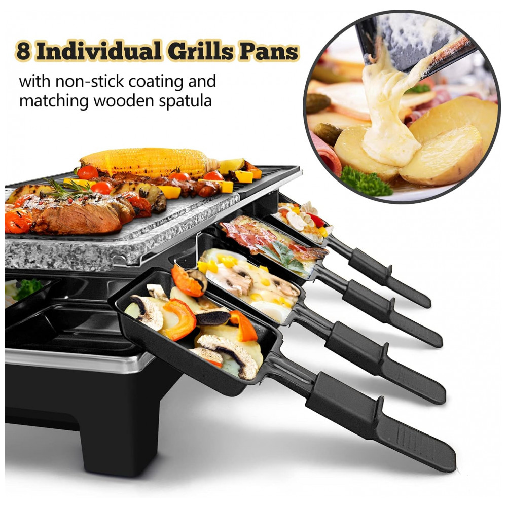 8 combinações individuais de bandejas de raclette nossas grelhas de raclette são todas equipadas com 8 panelas de raclette individuais e 8 espátulas de madeira para preparar comida deliciosa de raclette para várias pessoas ao mesmo tempo. Pode ser para fazer queijo raclette, sobremesas e outros alimentos, ou para manter os alimentos quentes. O revestimento antiaderente facilita o manuseio da remoção e limpeza dos alimentos.