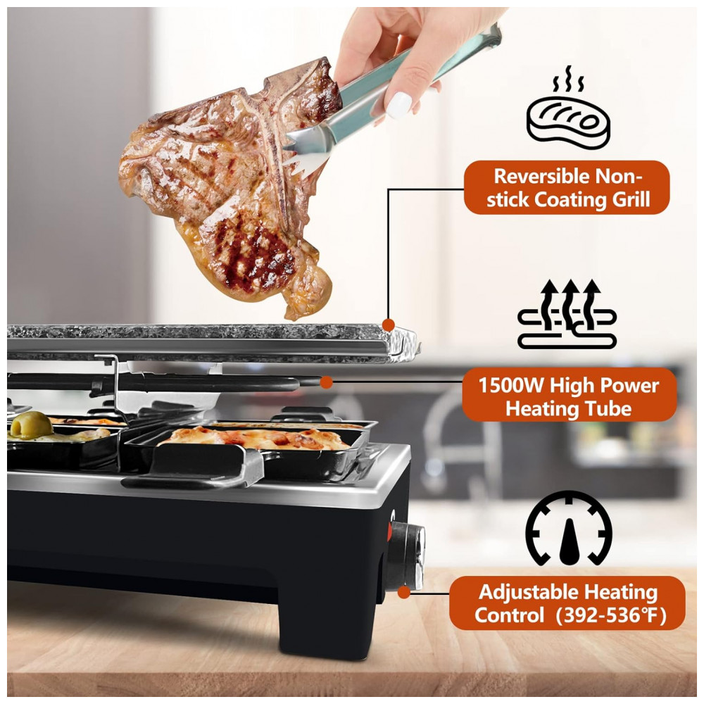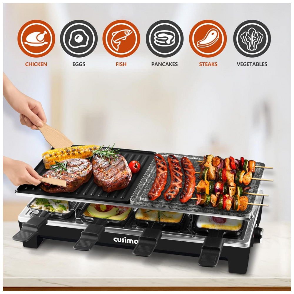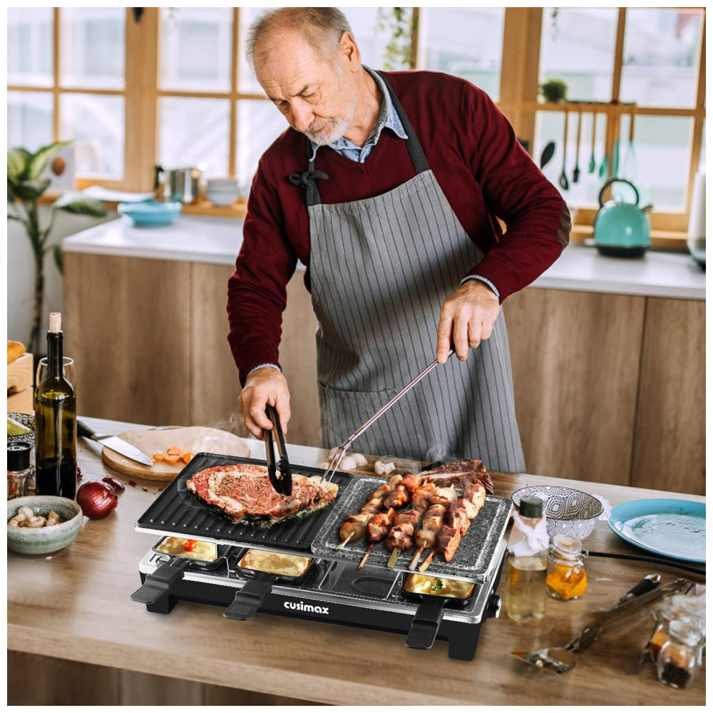 Portátil e fácil de limpar, a churrasqueira interna Cusimax é o seu restaurante social portátil A placa antiaderente reversível e a pedra natural para grelhar podem ser facilmente removidas. As 8 bandejas Raclette têm um revestimento antiaderente que pode facilmente ajudá lo a remover alimentos e limpá los facilmente. Com todos os acessórios removíveis e fáceis de guardar e mover. Ideal para festas e jantares em família.