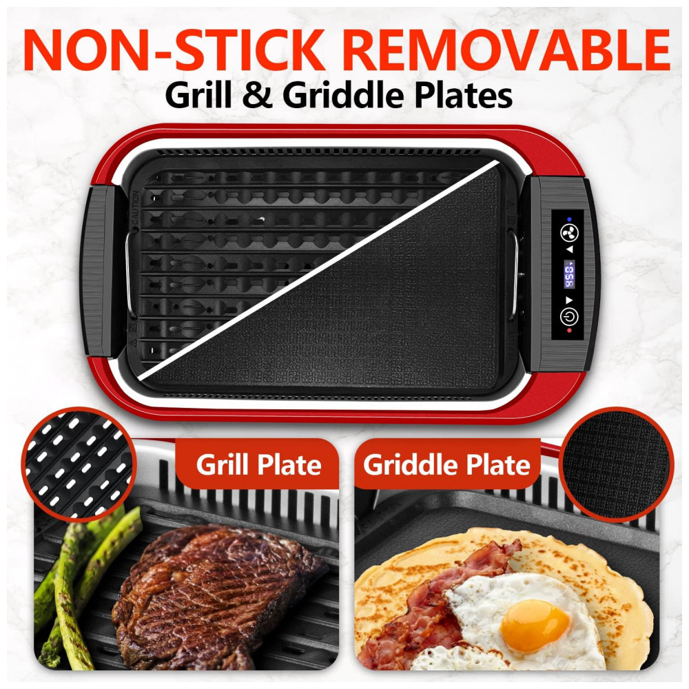 Aquece rápido e cozinha uniformemente É VERSÁTIL. Você pode grelhar quase tudo nesta grelha. Com os tubos de aquecimento duplo U para fornecer aquecimento rápido e estável para a churrasqueira, você pode desfrutar de um delicioso churrasco em poucos minutos. A chapa perfurada da grelha pode filtrar o excesso de óleo, além de deixar a carne com as marcas da grelha como um grelhador a carvão. A placa de grelha pode grelhar deliciosos ovos e bacon para o café da manhã, panquecas e muito mais. Qualquer coisa que você grelharia do lado de fora, você pode grelhar dentro de casa