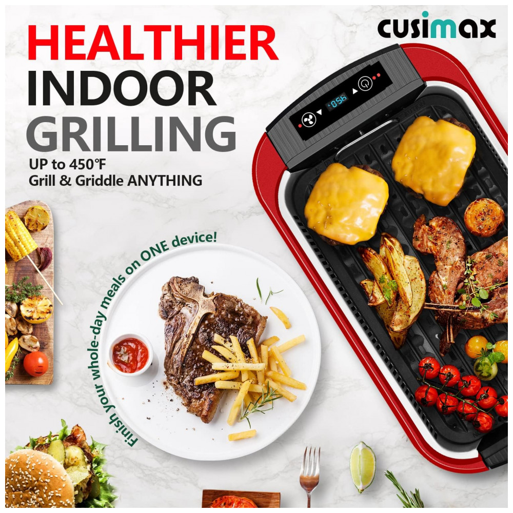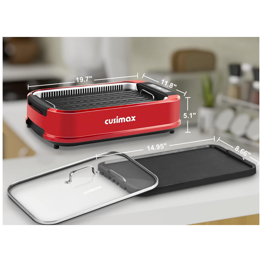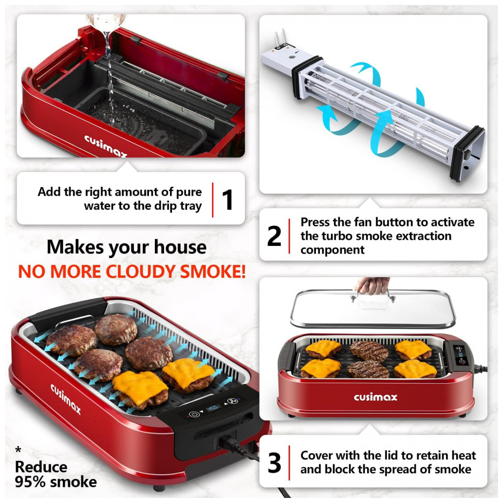 Grelhe quando e onde quiser A churrasqueira elétrica sem fumaça Cusimax é ideal para qualquer situação de grelhar em ambientes internos, especialmente aqueles em pequenos espaços confinados como um apartamento na cidade. Isso faz com que sua casa NÃO FUME MAIS NEBULOSA. Não há necessidade de lutar com grelhar do lado de fora em uma tempestade e sufocar até a morte com a fumaça de sua churrasqueira ao ar livre ficando presa no guarda sol do pátio. Apenas sentar e grelhar e comer churrasco em casa Este GRELHADOR INTERIOR ELÉTRICO ainda economiza seu dinheiro indo para fora para churrasco.