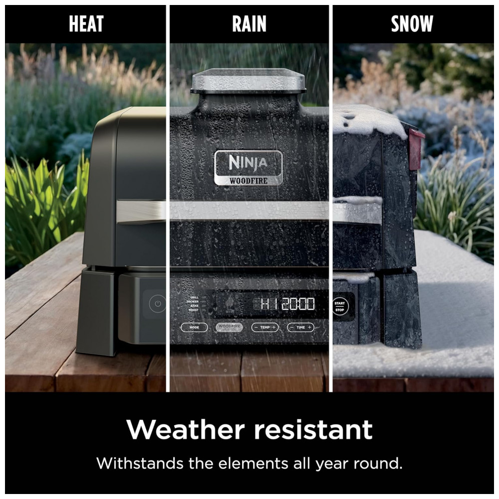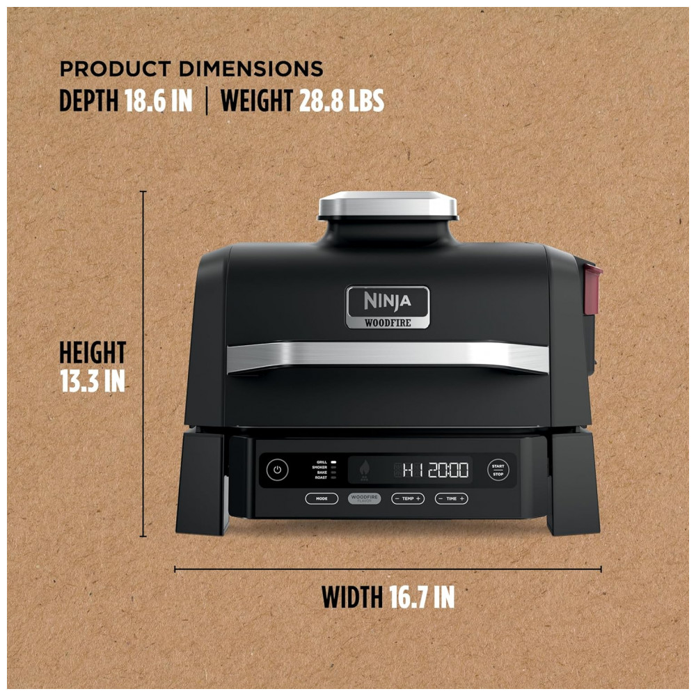 A churrasqueira elétrica Ninja Woodfire OG301 foi desenvolvida para uso em áreas externas, reunindo funções de grelhar, defumar, assar e forno em um único equipamento compacto. A tecnologia Woodfire utiliza pellets de madeira em uma caixa de fumaça dedicada para adicionar sabor defumado aos alimentos, enquanto o aquecimento principal é feito por resistência elétrica.